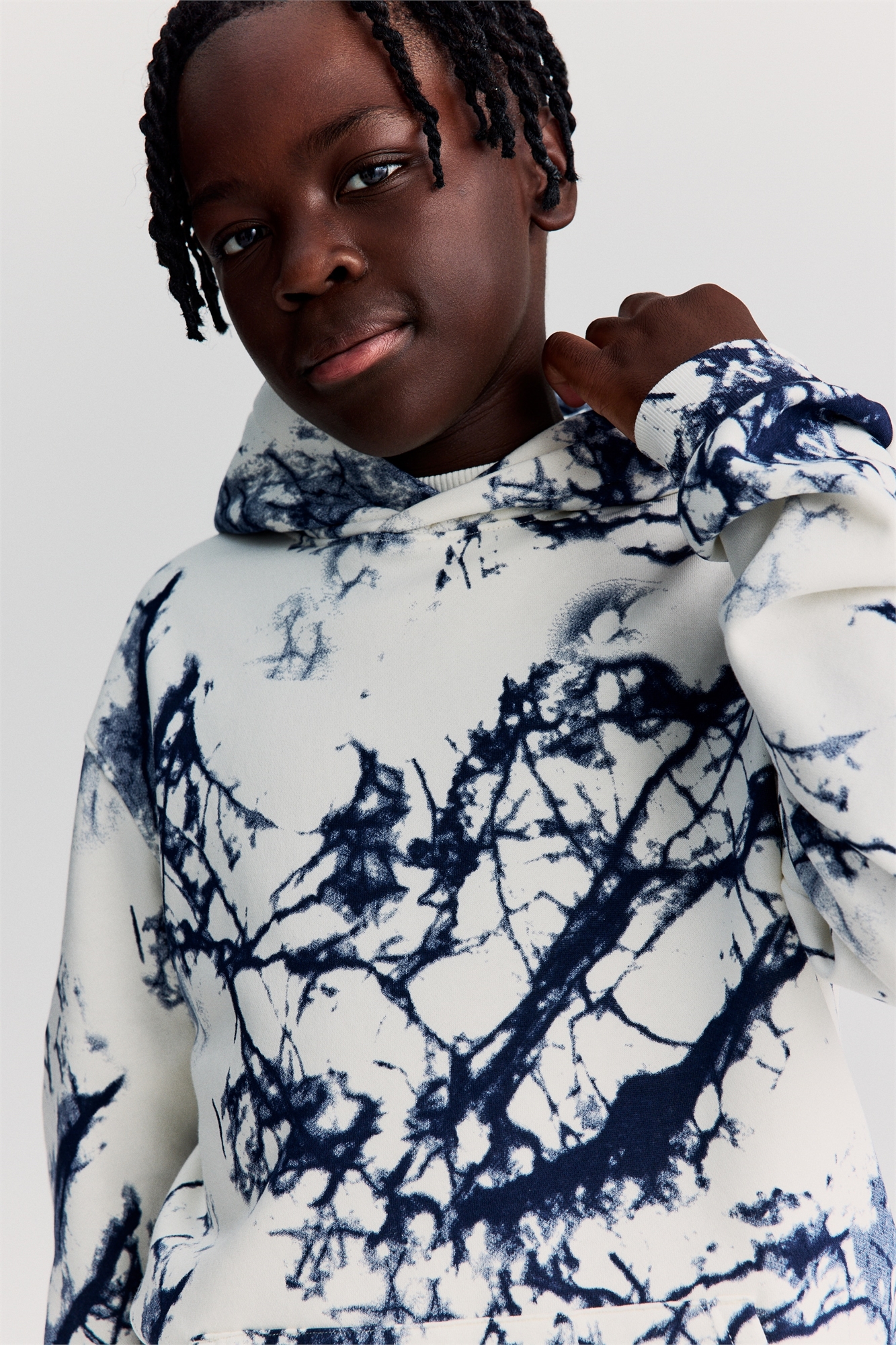 Толстовка из хлопковой ткани с мягким начесом внутри. Капюшон на подкладке, завязки спереди, спущенные плечи и карман-кенгуру. Ребристые манжеты и подол.