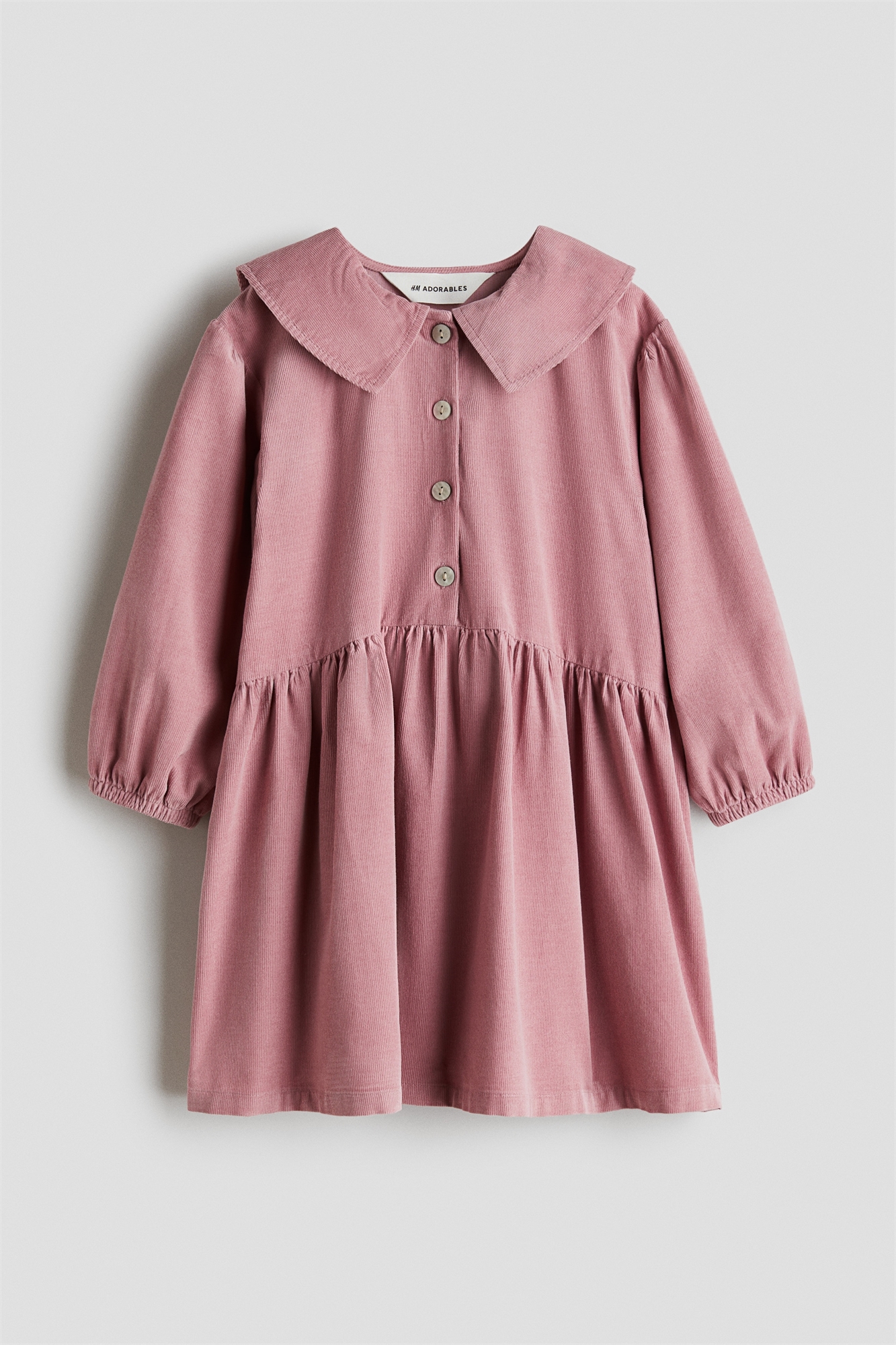 H&M Adorables. Платье из мягкого хлопкового вельвета с матросским воротником, пуговицами в верхней части, спущенными плечами, длинными рукавами-баллончиками с эластичными манжетами, сборчатым швом на талии и слегка расклешенной юбкой. Коллекция H&M Adorables - это подборка удобных и качественных вещей, не теряющих актуальности.