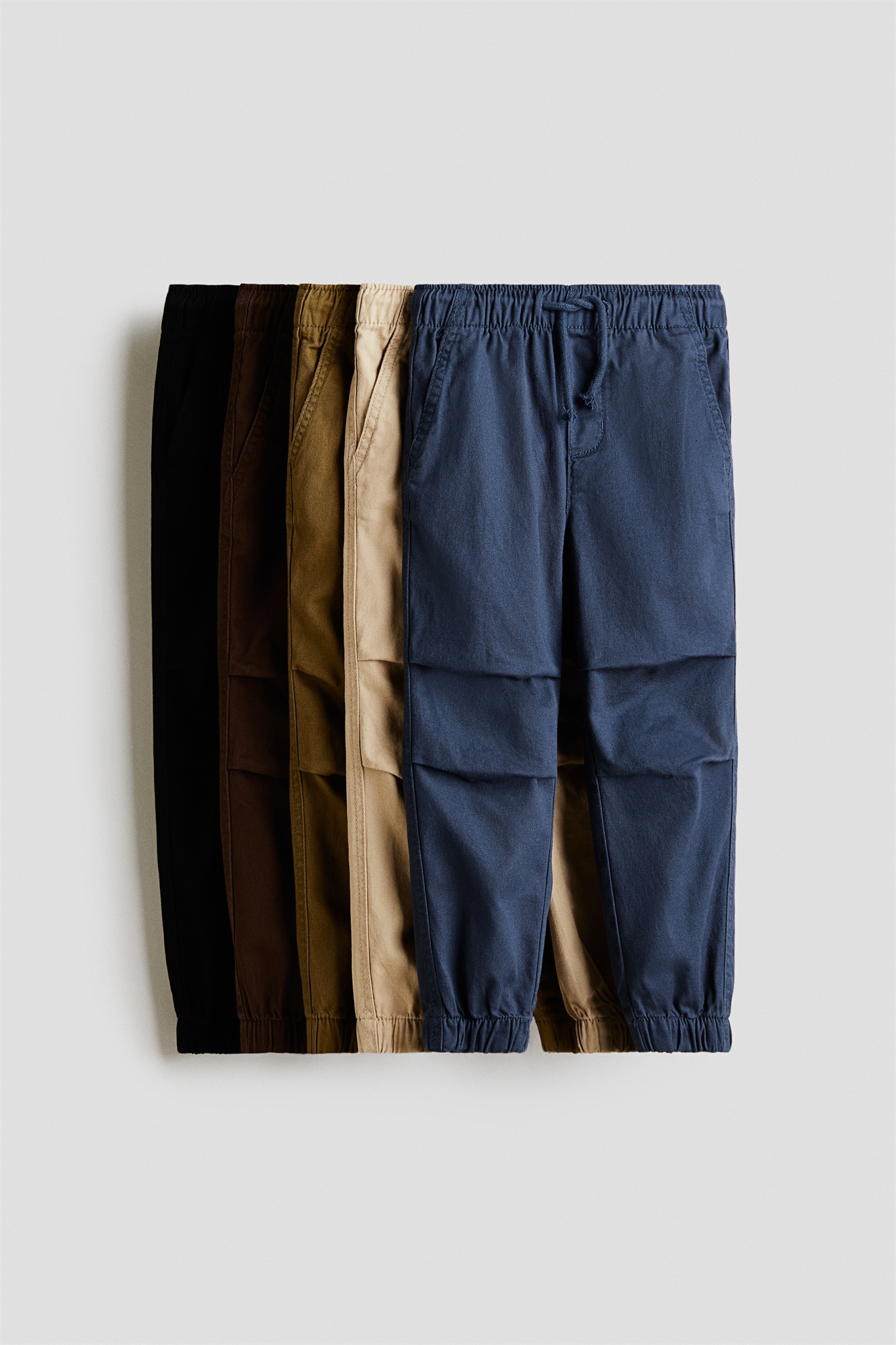 Джоггеры из хлопкового твила с плиссированными коленями. Эластичный пояс с завязками, фальшивая ширинка, диагональные боковые карманы и эластичная резинка по краям.
