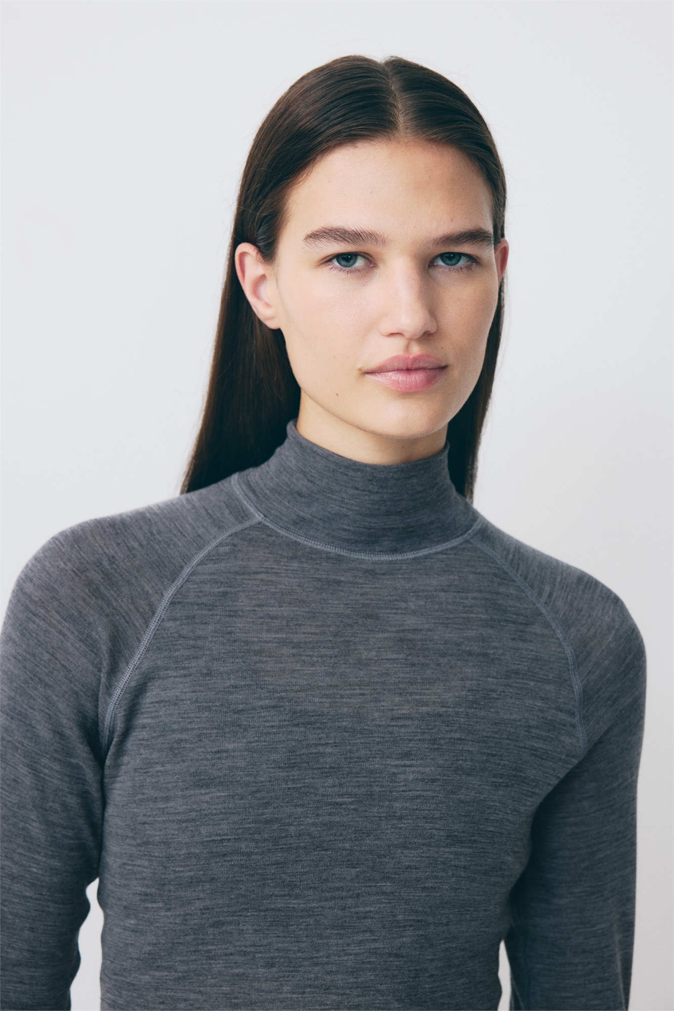 Нижняя футболка из эластичного трикотажа из мягкой шерсти мериноса согреет вас во время катания на лыжах. Облегающий крой с воротником и длинными рукавами реглан.