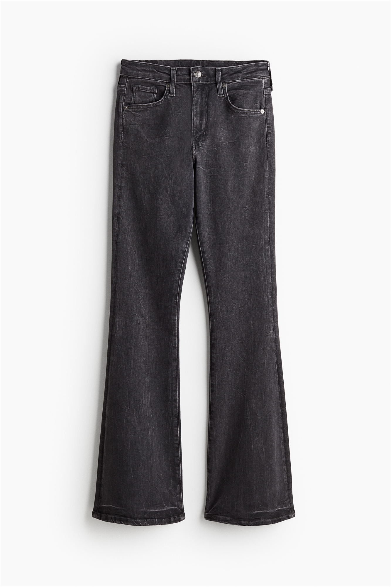 Джинсы с 5 карманами из денима с дополнительной растяжкой для максимального комфорта. Расклешенные штанины с зауженной посадкой от талии до бедра и расклешенным кроем от колена до подола. Завышенная талия с ширинкой на молнии и пуговице. Регулярная длина, рассчитанная на то, чтобы доходить до верхней части стопы, практически не оставляя следов. Носите с любыми вещами - от кроп-топов до толстого трикотажа.