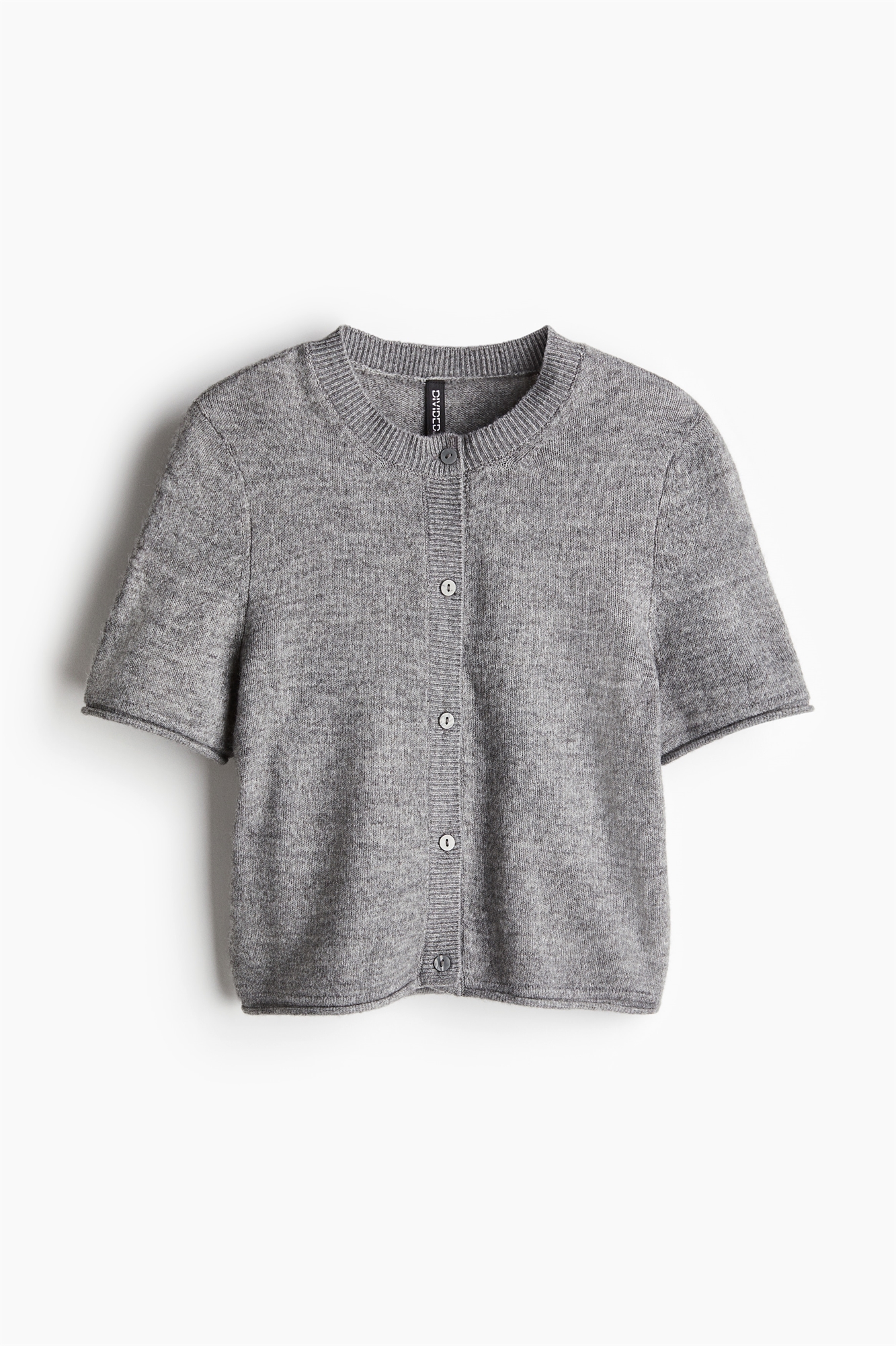 Короткий приталенный кардиган из мягкого тонкого трикотажа с круглым вырезом в рубчик, перламутровыми пуговицами спереди, короткими рукавами и тесьмой по пуговицам. Манжеты и подол окантованы.