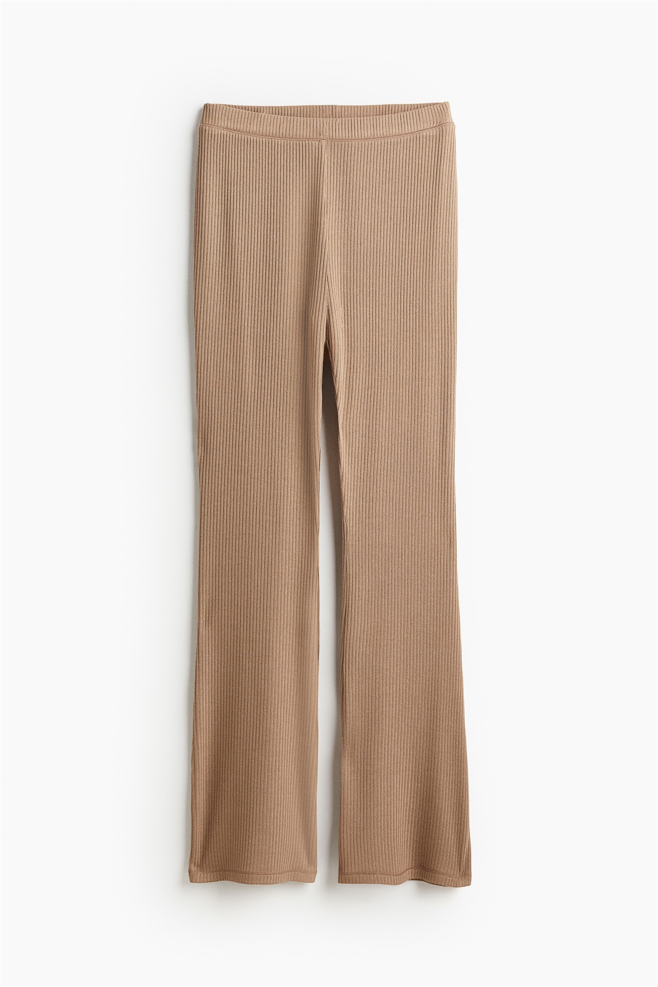 Брюки из ребристого трикотажа с эластичной вставкой на талии и зауженными ногами с расклешенными краями.