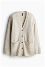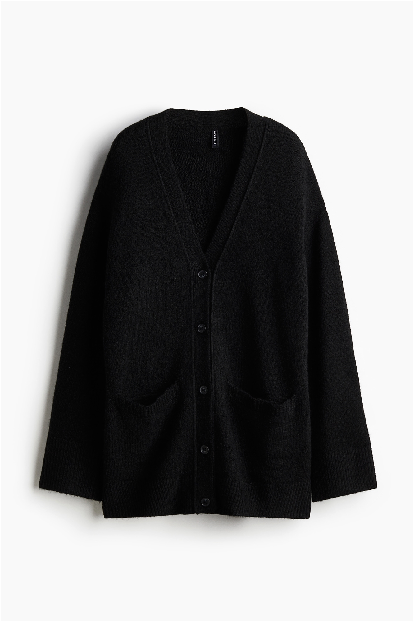 Кардиган оверсайз из мягкого трикотажа с V-образным вырезом и пуговицами спереди. Спущенные плечи, длинные рукава и неброские передние карманы. Манжеты, подол и проймы карманов обработаны ребрами жесткости.