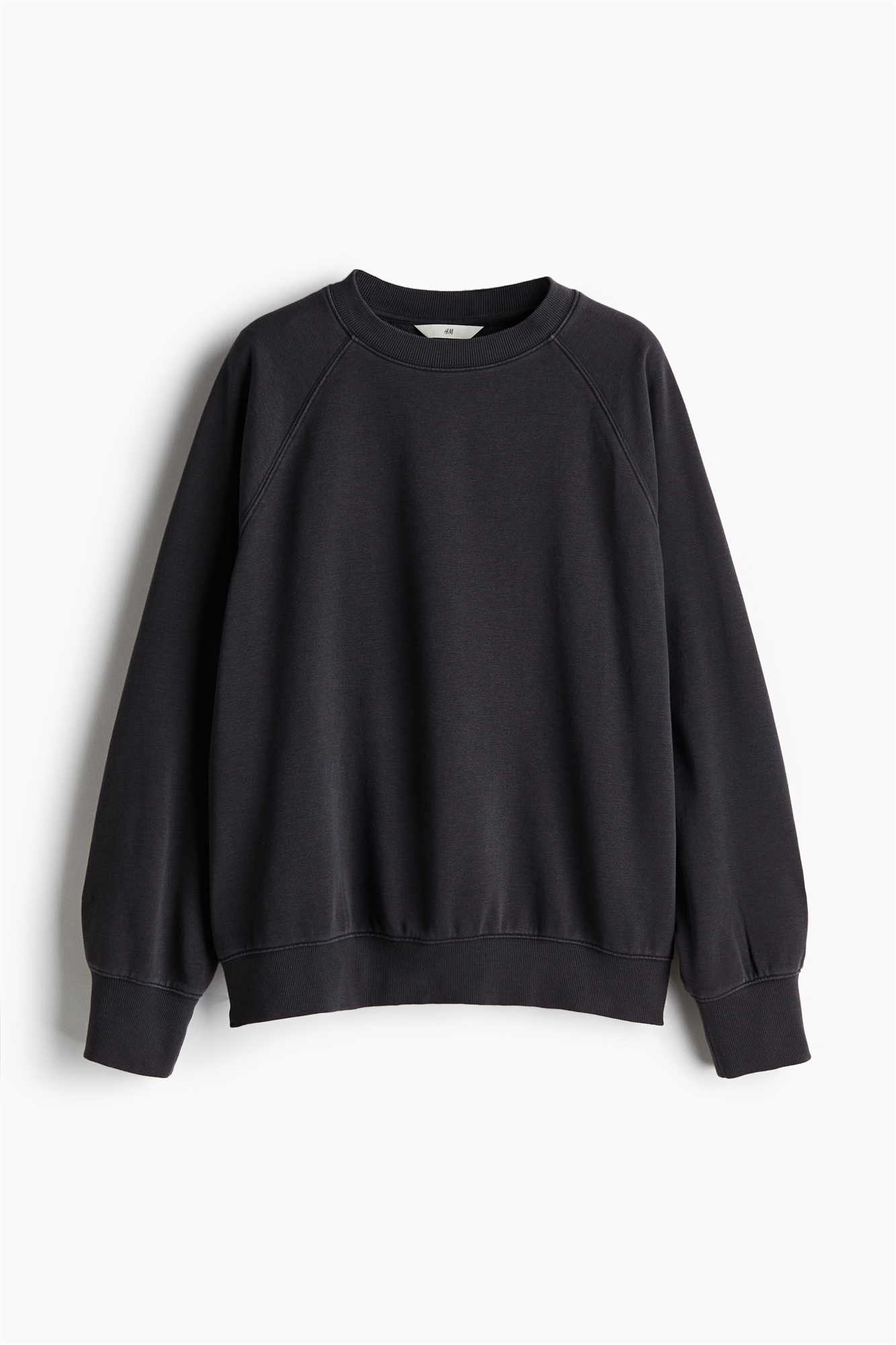 Свободный топ из толстовочной ткани с мягкой ворсистой изнанкой. Круглый вырез, длинные рукава реглан и окантовка по вырезу, манжетам и подолу.