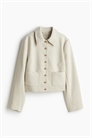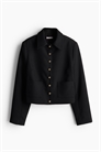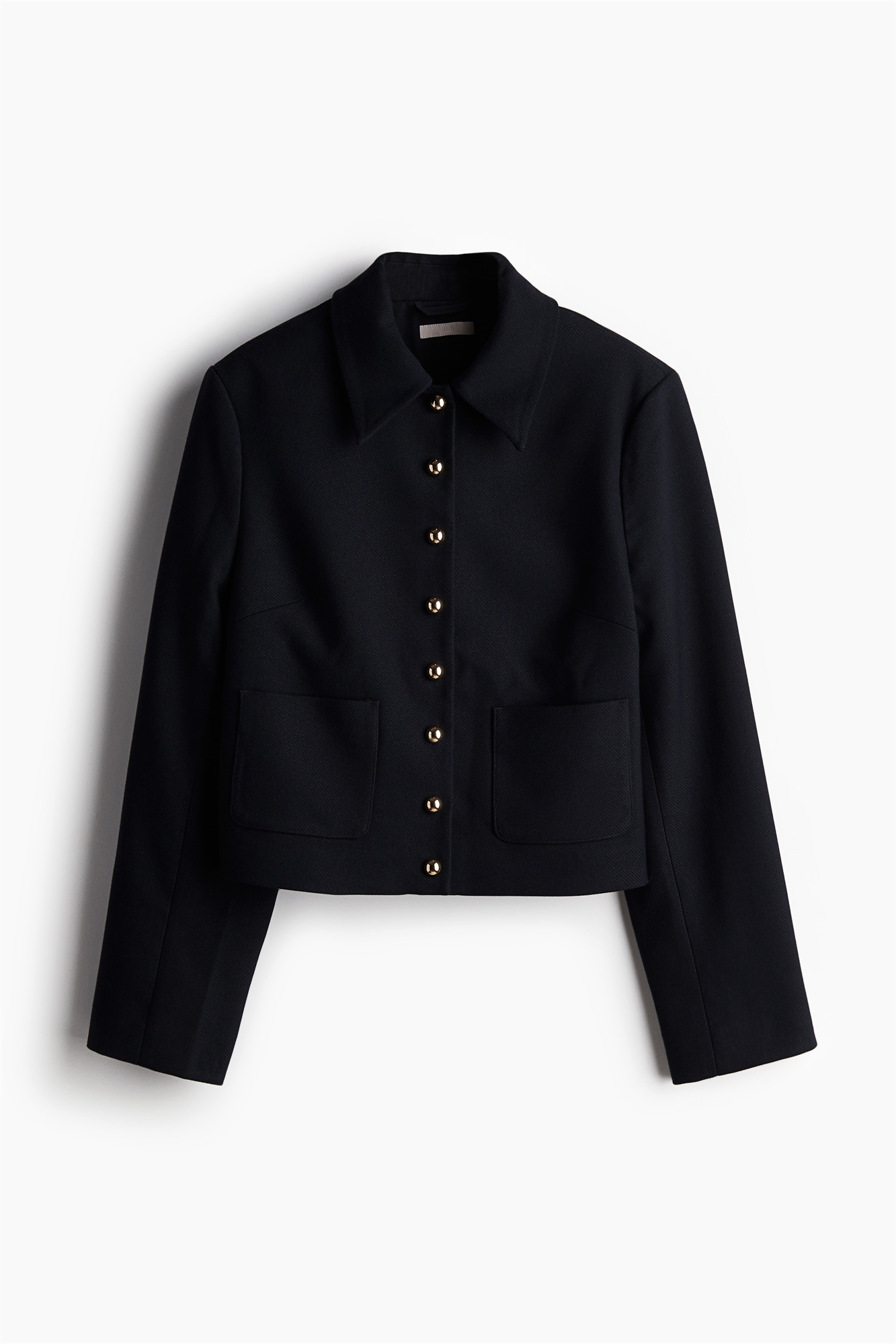 Куртка из саржи с воротником, застежкой на кнопки спереди, накладными передними карманами и длинными рукавами с тонкими подплечниками и пуговицами золотистого цвета на манжетах. На подкладке.
