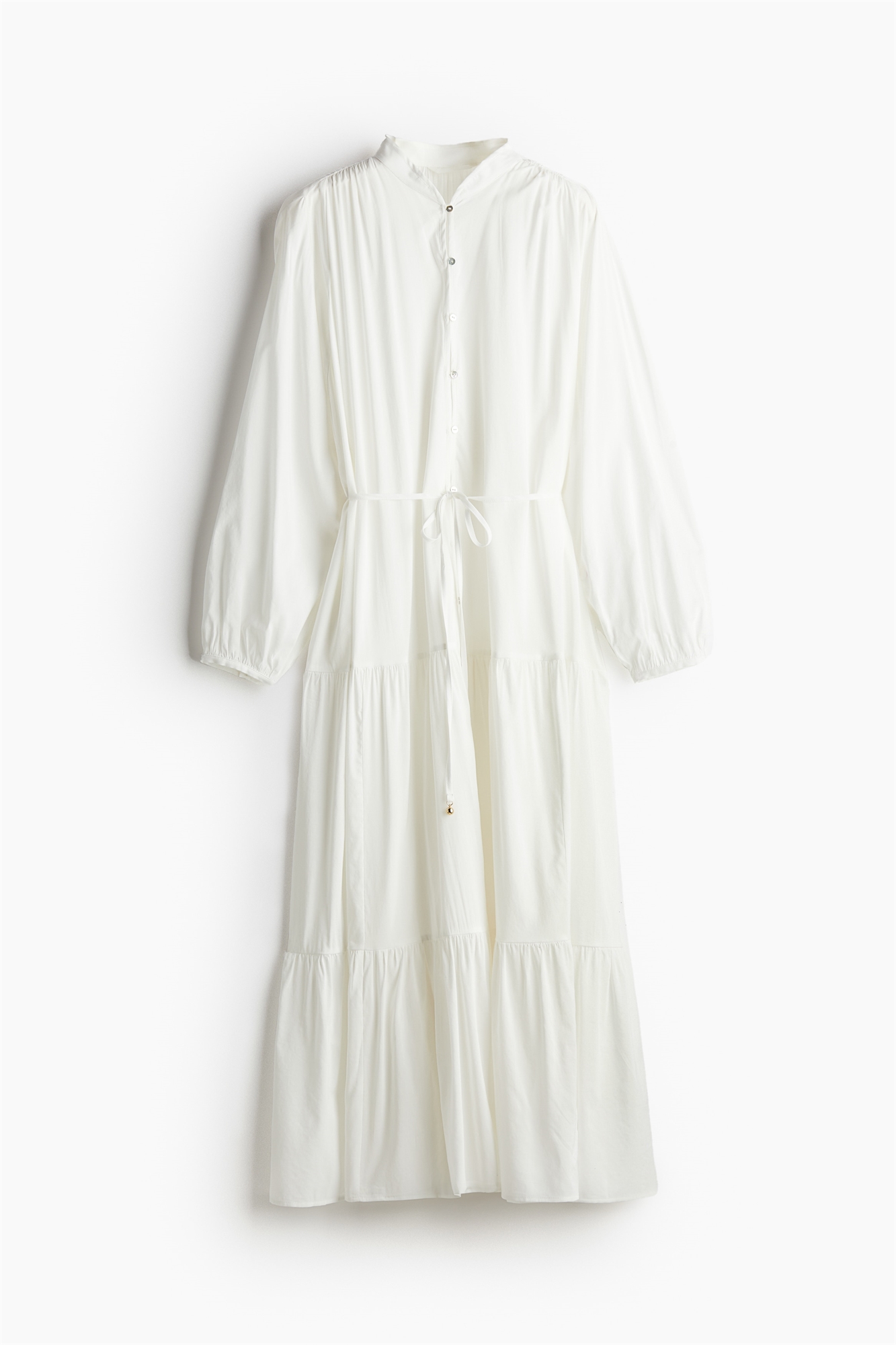 Платье длиной до щиколоток с воздушным переплетением из смеси хлопка и вискозы. Воротник-бант и сборки на плечах и сзади на шее создают эффект легкой драпировки. Мерцающие пуговицы спереди и узкий съемный пояс-завязка на талии. Длинные рукава-баллоны и узкие манжеты с разрезом и пуговицей. Расклешенная юбка с собранными ярусами. Без подкладки.