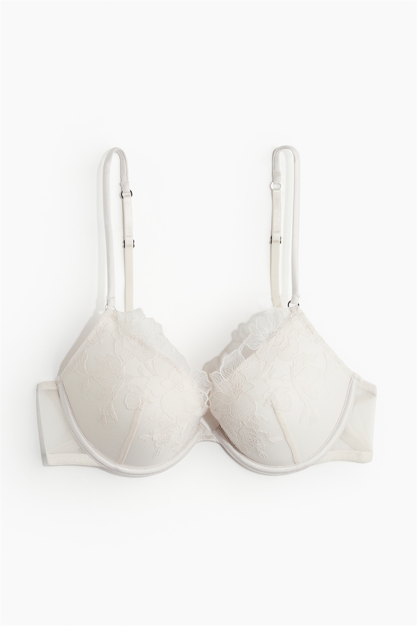 Бюстгальтер пуш-ап из сетки с нежной вышивкой, регулируемыми бретелями и чашечками с мягкой подкладкой для увеличения объема бюста и декольте. Застежка на крючки и глазки сзади.