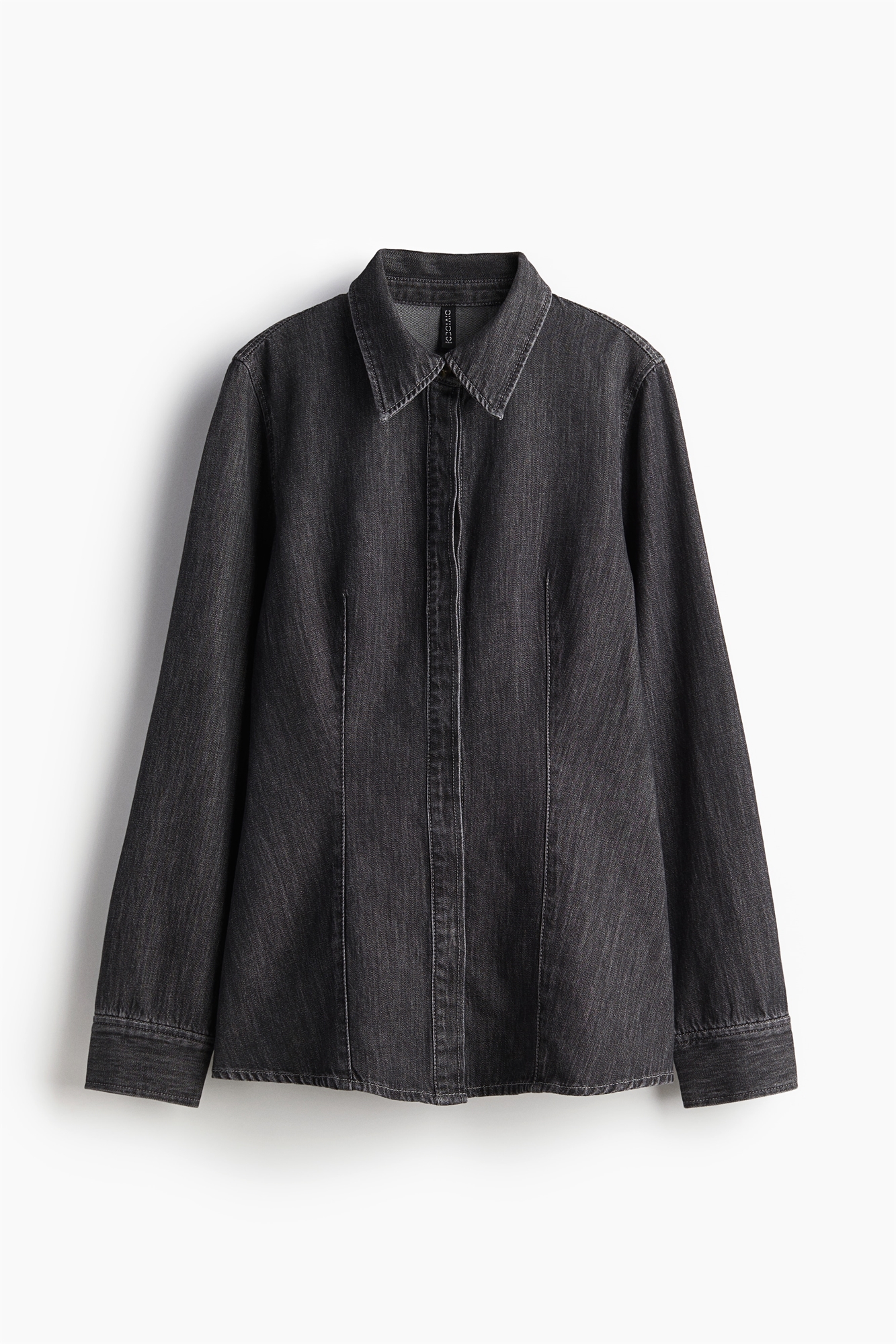 Приталенная рубашка из плотного денима с воротником, потайными пуговицами спереди и длинными рукавами с манжетами на пуговицах. Зауженная талия со складками и слегка закругленный подол.