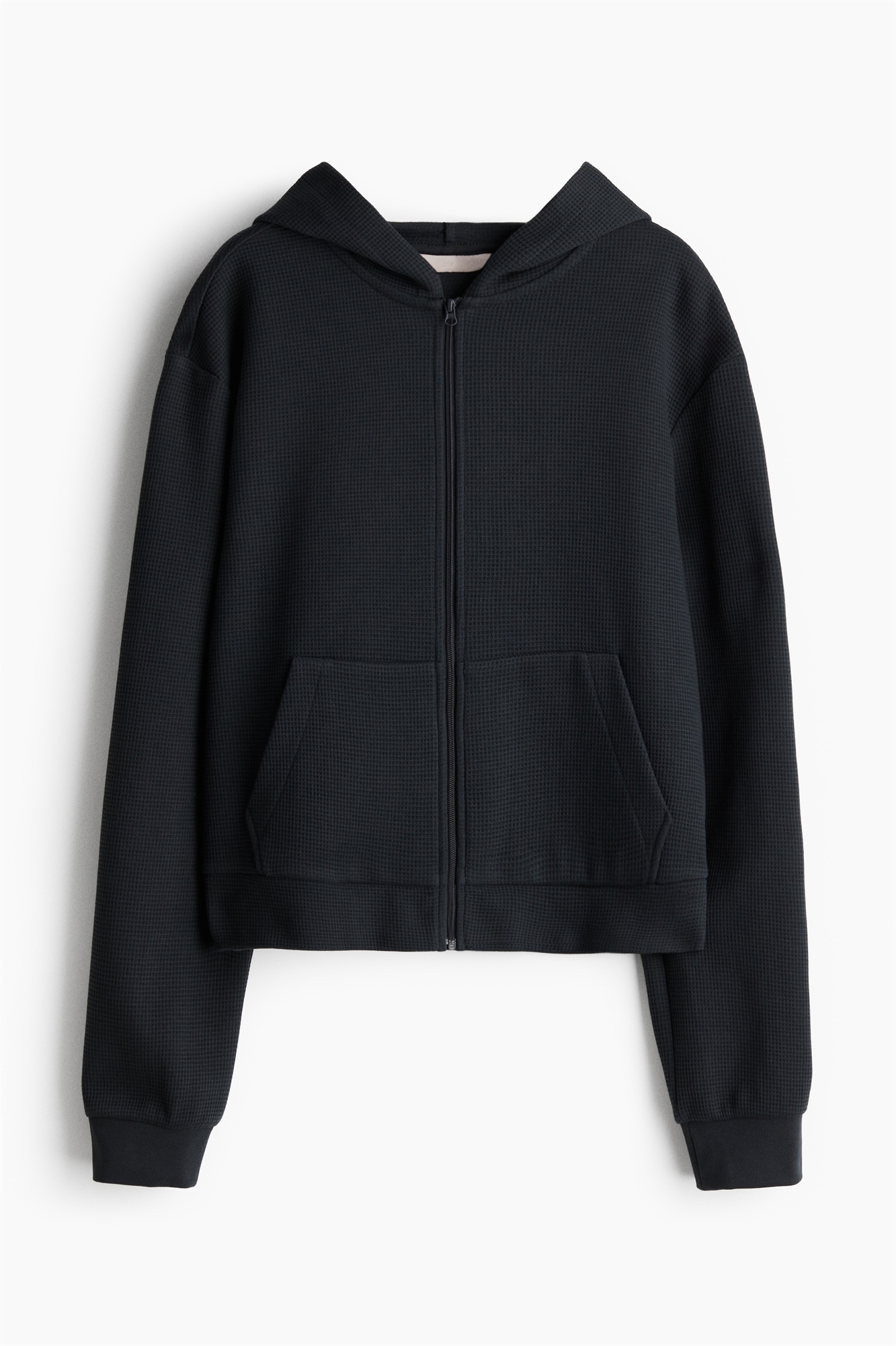 Толстовка на молнии из вафельного трикотажа с капюшоном, застежкой-молнией спереди, карманами-кенгуру и длинными рукавами с манжетами в рубчик.