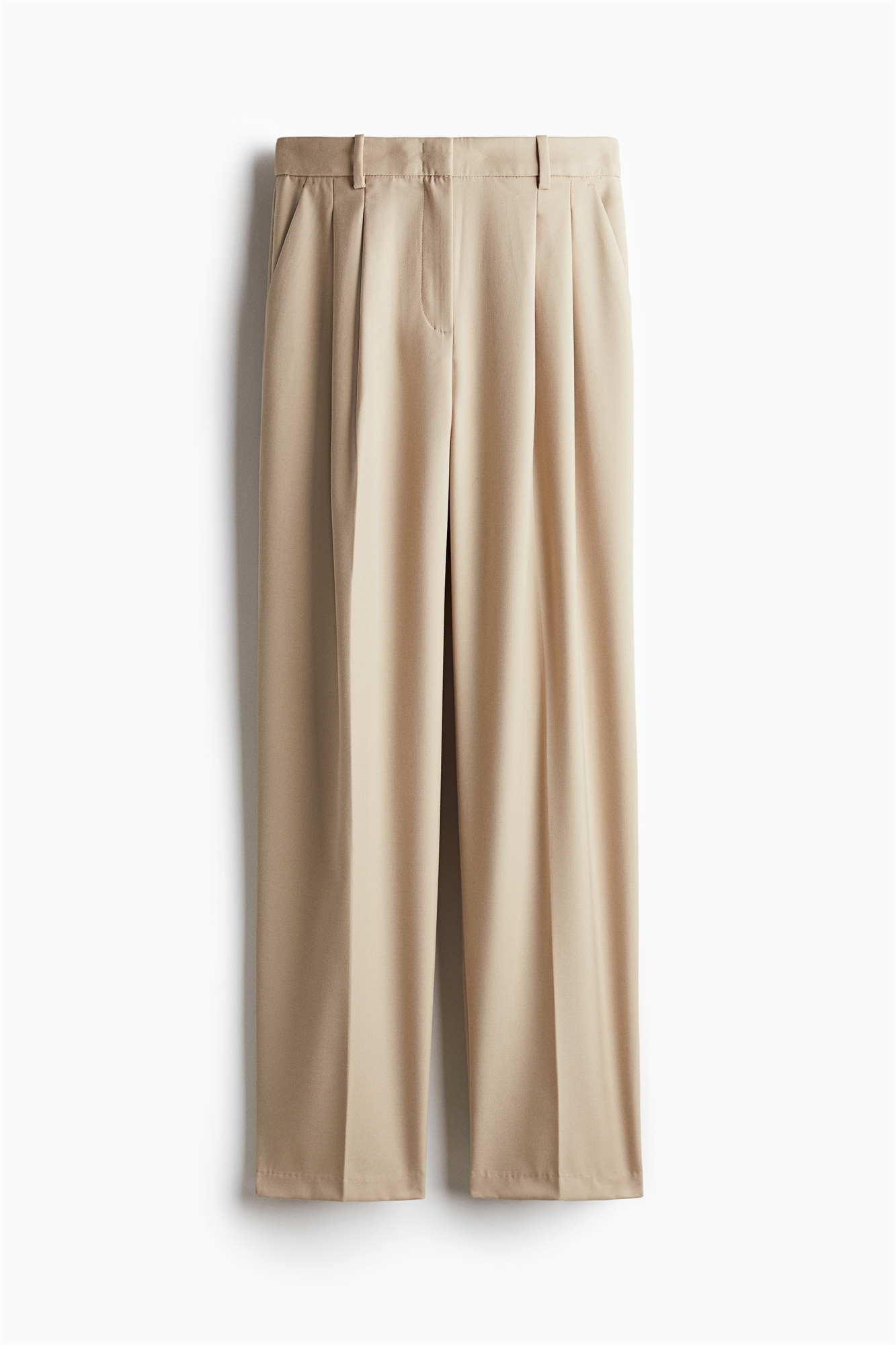 Приталенные брюки из тканого материала с высокой талией и ширинкой на молнии с потайной пуговицей и застежкой на крючок и глазок. Свободный крой со складками спереди, диагональными боковыми карманами и втачными задними карманами. Зауженные ноги со складками спереди и сзади.