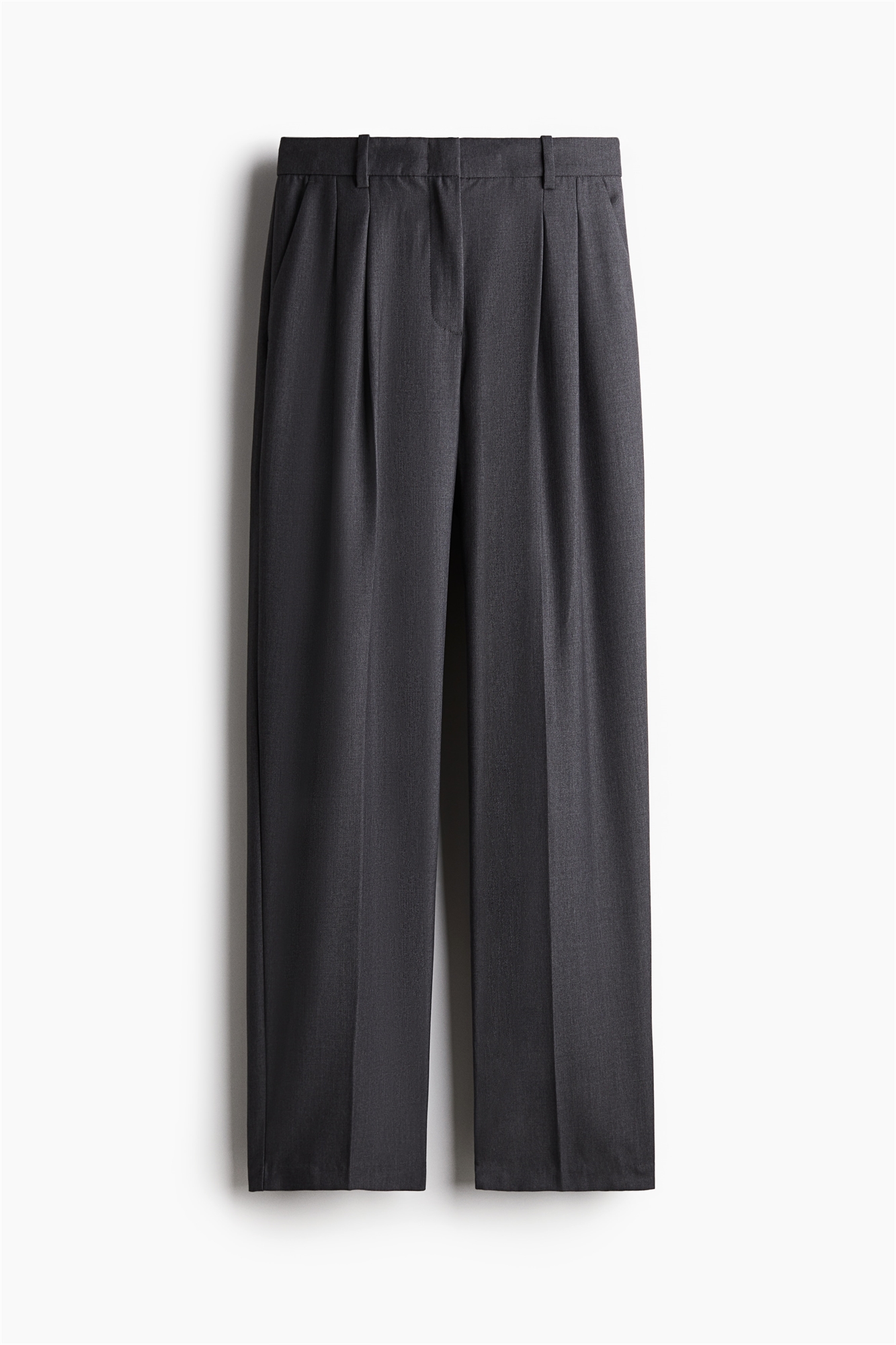 Приталенные брюки из тканого материала с высокой талией и ширинкой на молнии с потайной пуговицей и застежкой на крючок и глазок. Свободный крой со складками спереди, диагональными боковыми карманами и втачными задними карманами. Зауженные ноги со складками спереди и сзади.