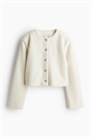 Свободный кардиган из мягкого тедди с круглым вырезом, металлическими пуговицами спереди, подплечниками и длинными рукавами.