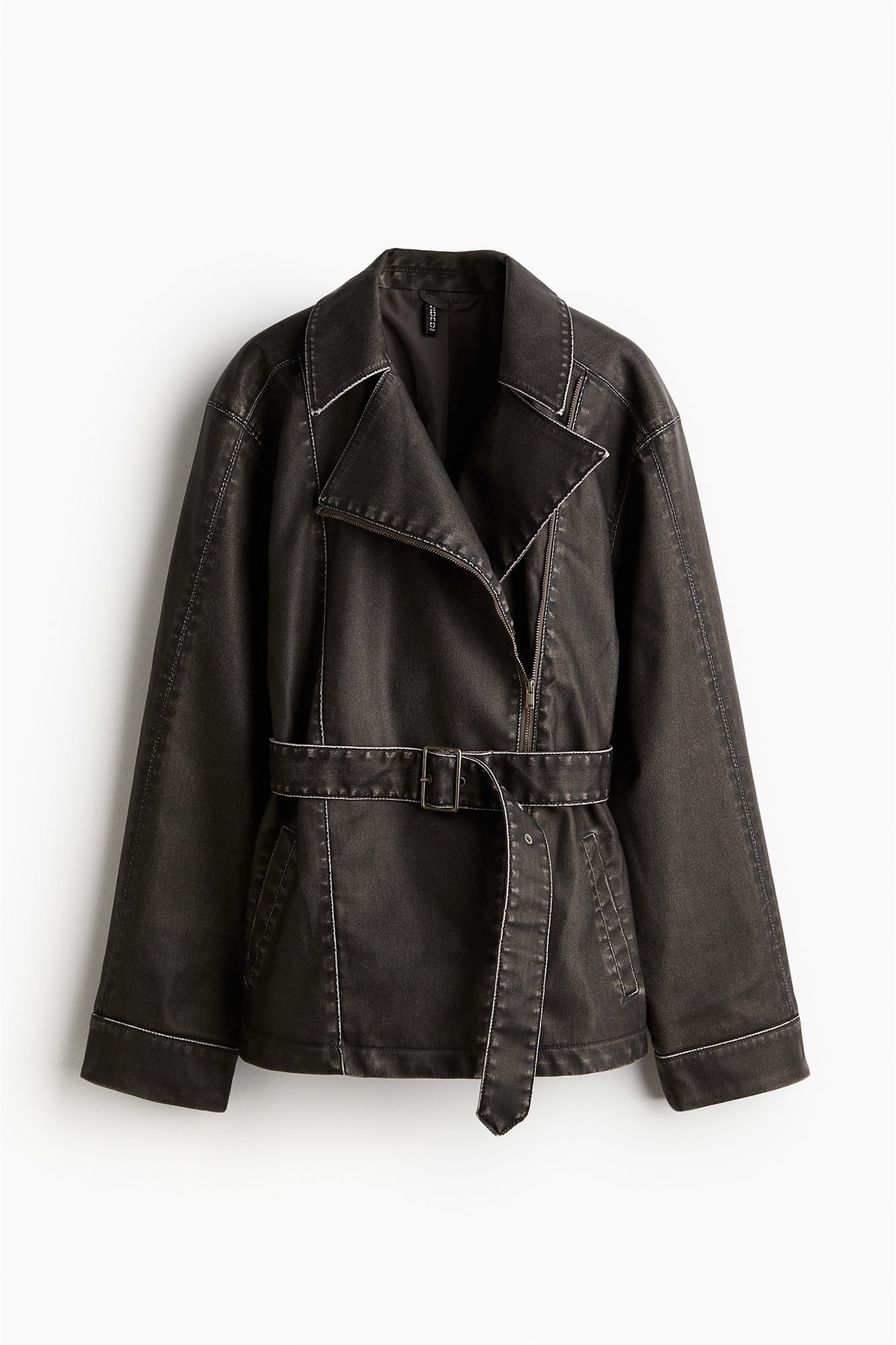 Байкерская куртка из мелованной ткани с потертым внешним видом. Лацканы с вырезом, диагональная застежка-молния спереди и плечевые швы спереди. Прорезные карманы спереди и съемный регулируемый ремень на талии. На подкладке.