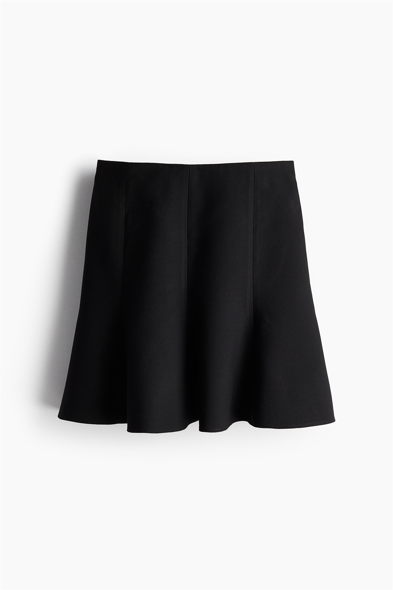 Короткая юбка А-линии из тканого материала с высокой талией и потайной застежкой на молнию и пуговицу сзади. Видимые швы спереди и сзади и расклешенный силуэт с расклешенным подолом.