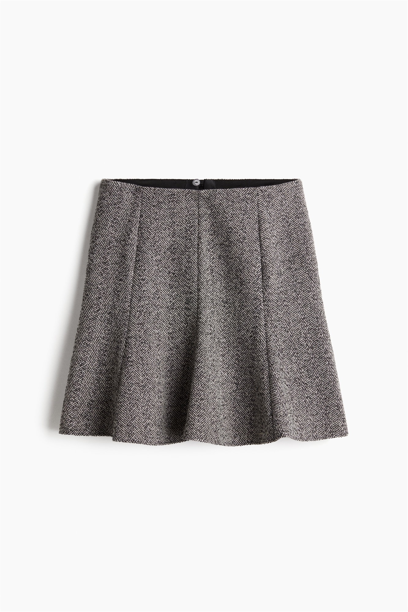 Короткая юбка А-линии из тканого материала с высокой талией и потайной застежкой на молнию и пуговицу сзади. Видимые швы спереди и сзади и расклешенный силуэт с расклешенным подолом.