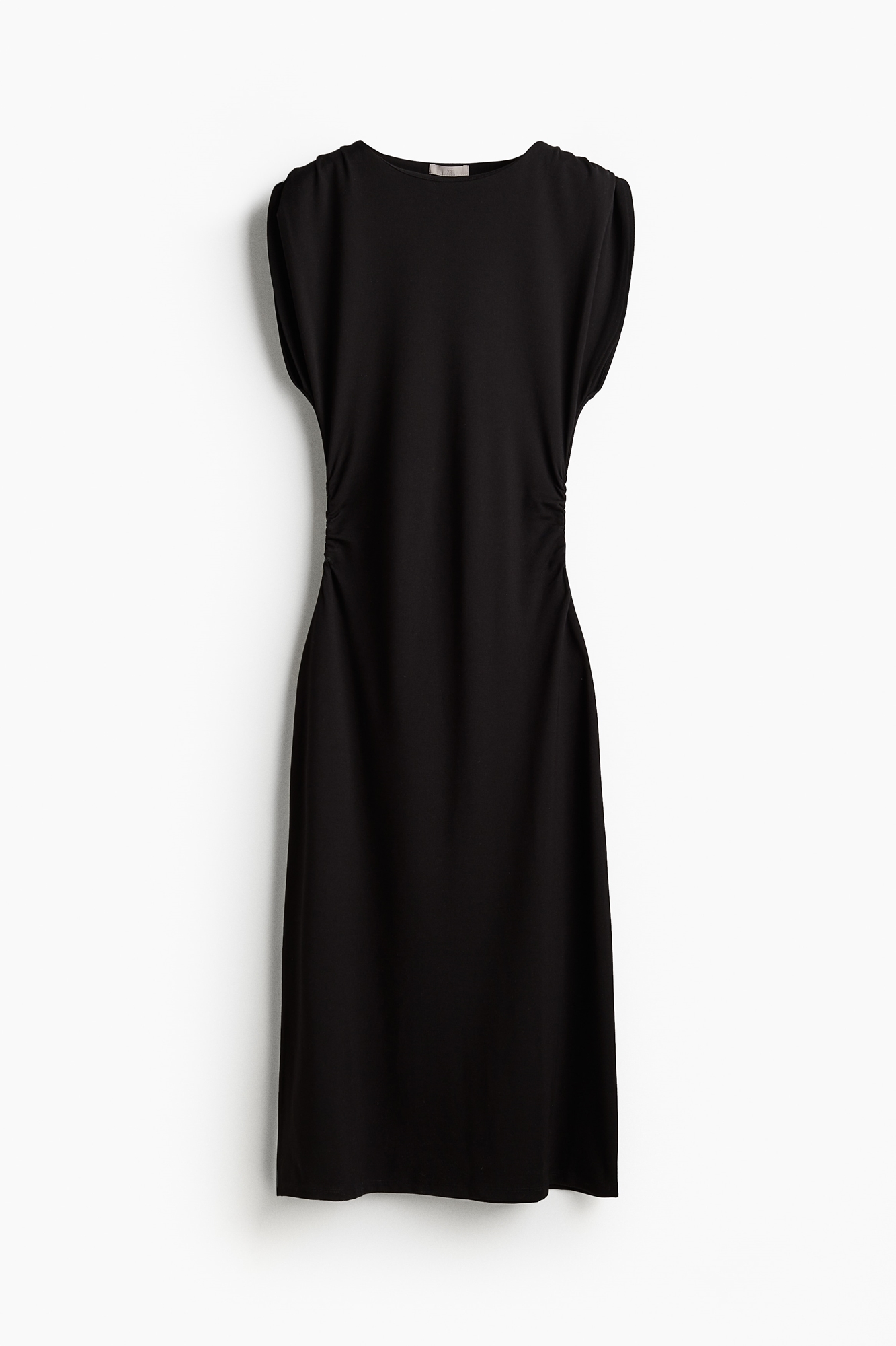 Платье длиной до колен из плотного джерси с вырезом-лодочкой и короткими рукавами со складками на плечах. Сборка на талии для легкой драпировки. Сверху на подкладке.