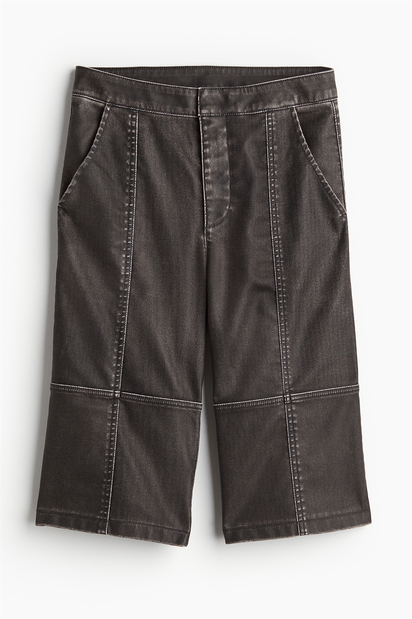 Брюки-капри длиной 3/4 с непринужденной посадкой из лакированной ткани с потертым видом и видимыми швами спереди и сзади. Ширинка на молнии с потайной пуговицей и застежкой на крючок и глазок, диагональные передние карманы.