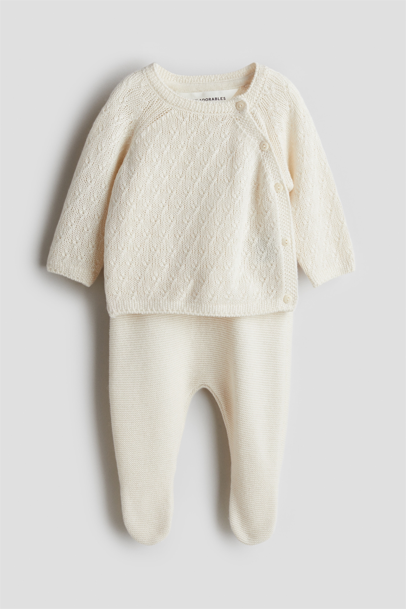 H&M Adorables. Комплект из джемпера и брюк из бархатистого трикотажа из смеси кашемира. Джемпер из трикотажа с узором, круглым вырезом в рубчик, длинными рукавами реглан, застежкой на пуговицы с одной стороны для удобства одевания, манжетами и подолом в рубчик. Брюки с эластичным поясом с завязками и полными ногами с эластичными каблуками. Коллекция H&M Adorables - это подборка удобных и качественных вещей, не теряющих актуальности.