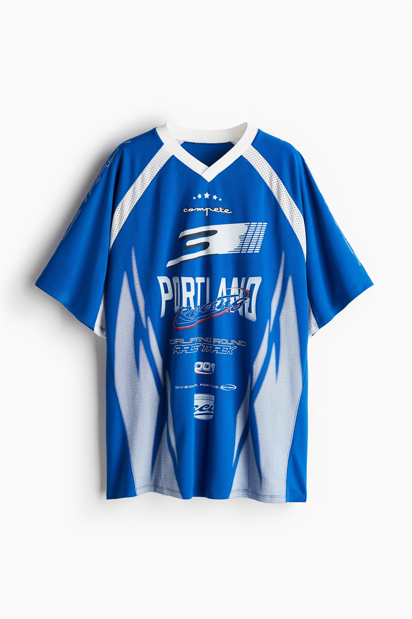 Футболка оверсайз из мягкого трикотажа с принтом и сетчатыми секциями. Ребристый V-образный вырез и рукава покроя реглан.