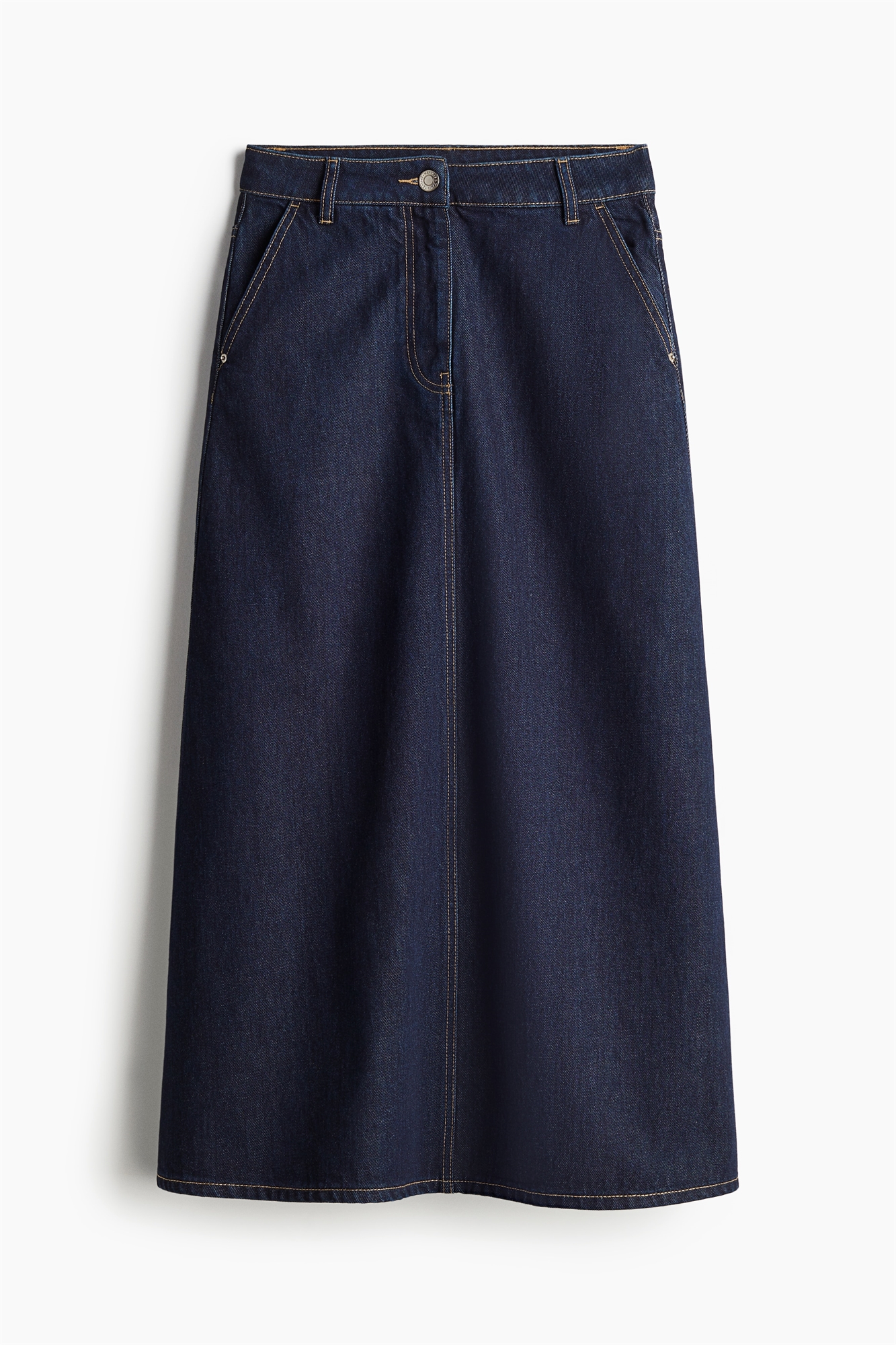 Юбка из денима длиной до колена с силуэтом A-line, заниженной талией, ширинкой на молнии и пуговице, диагональными боковыми карманами и накладными задними карманами.
