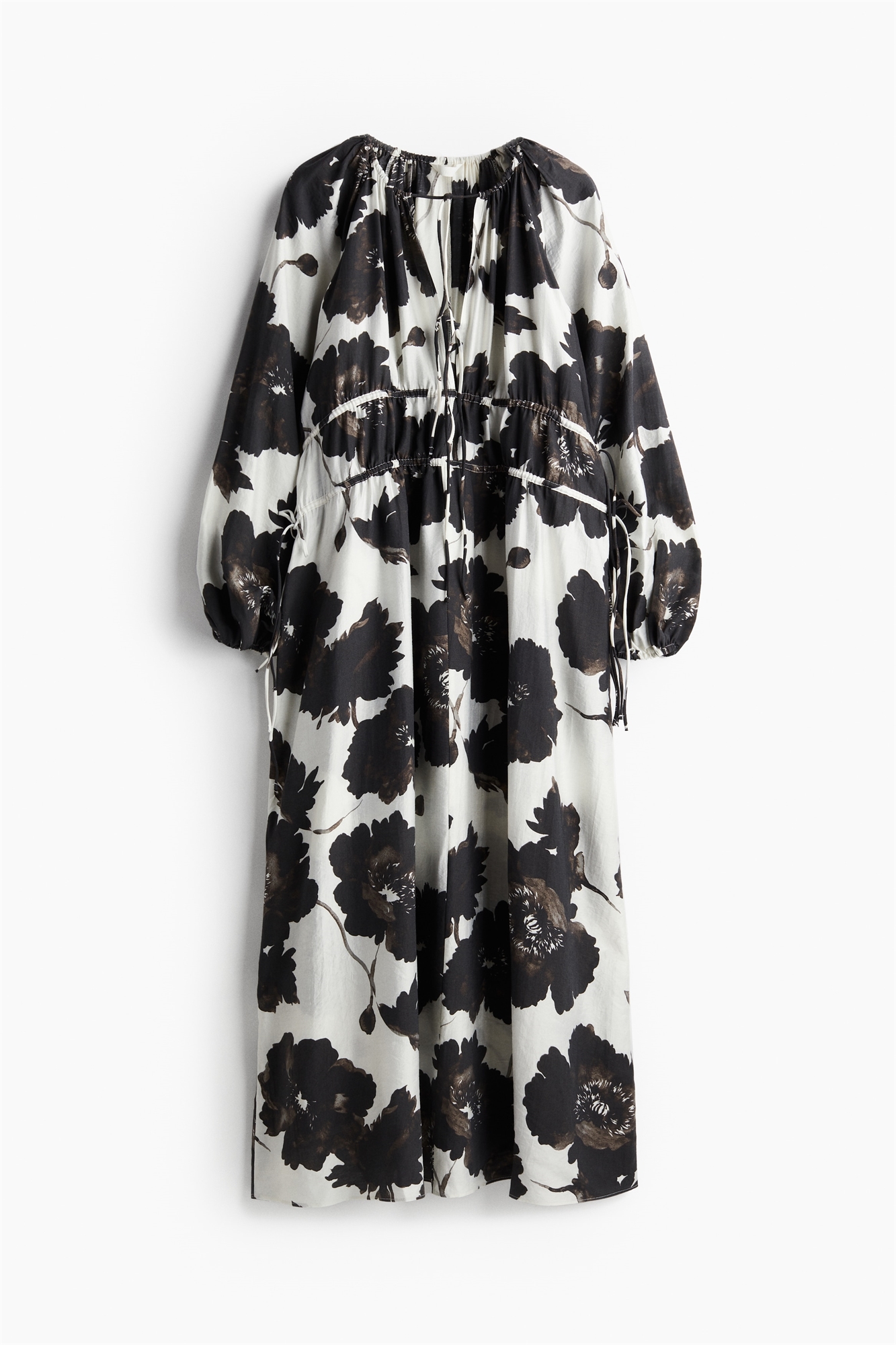 Платье длиной до щиколоток из тканого материала с круглым вырезом на завязках и V-образной проймой спереди. Двойные завязки на талии, завязывающиеся по бокам, и длинные рукава реглан с завязками на манжетах. Без подкладки.