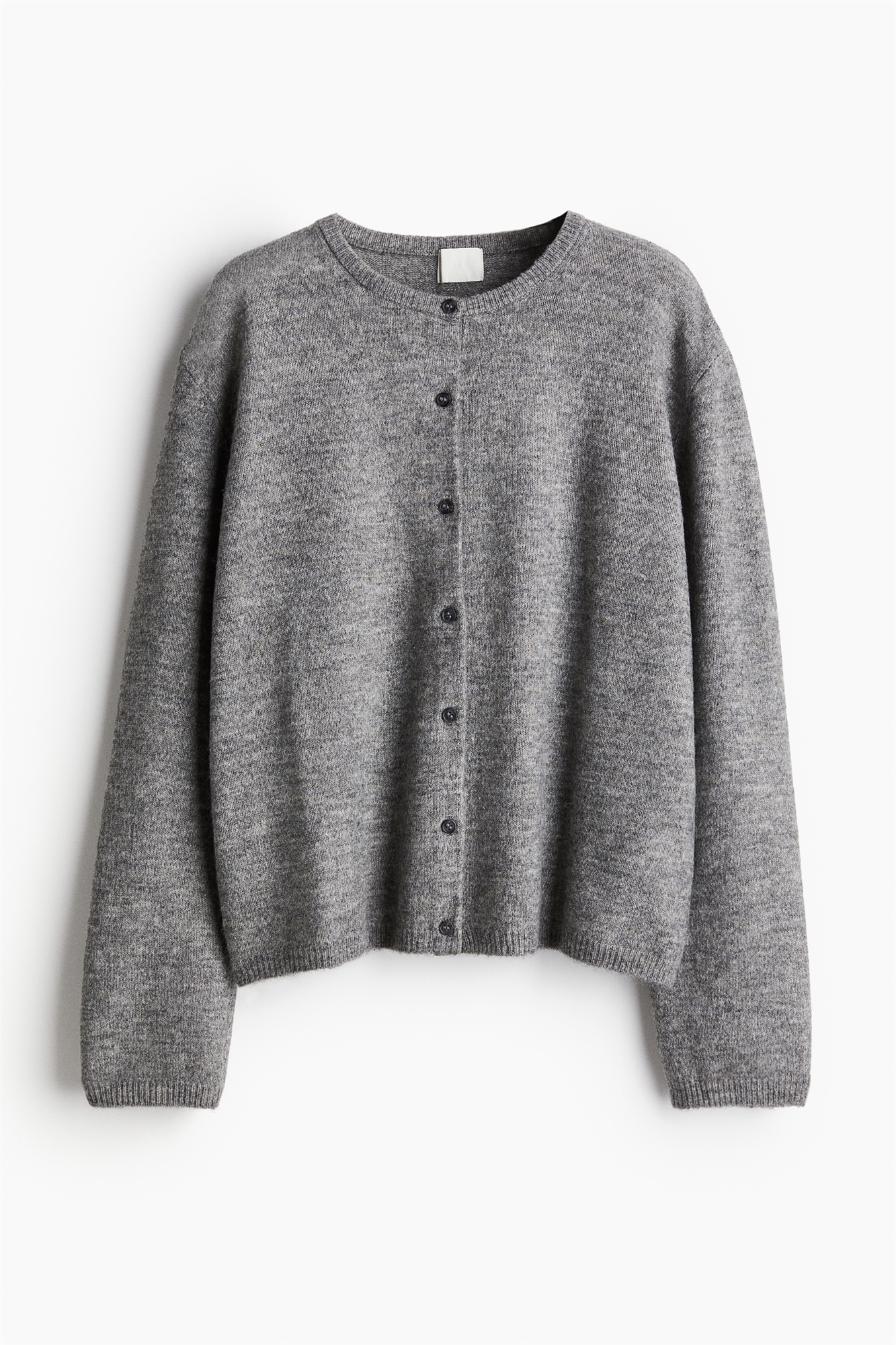 Свободный кардиган из мягкого трикотажа с добавлением шерсти. Круглый вырез, застежка на пуговицы спереди, слегка спущенные плечи и длинные рукава. Узкая тесьма вокруг выреза, на манжетах и подоле.
