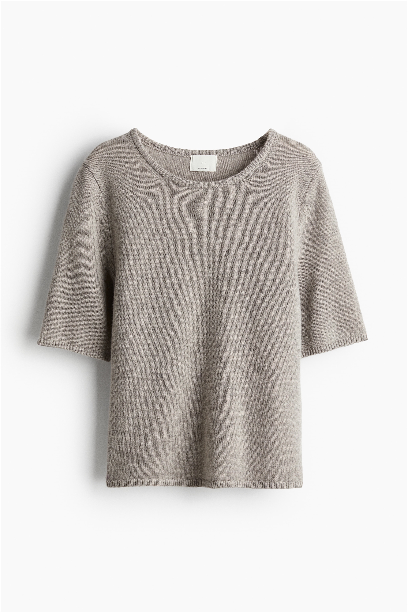 Облегающая футболка из мягкого кашемира тонкой вязки с узкой тесьмой по вырезу горловины, манжетам и подолу.