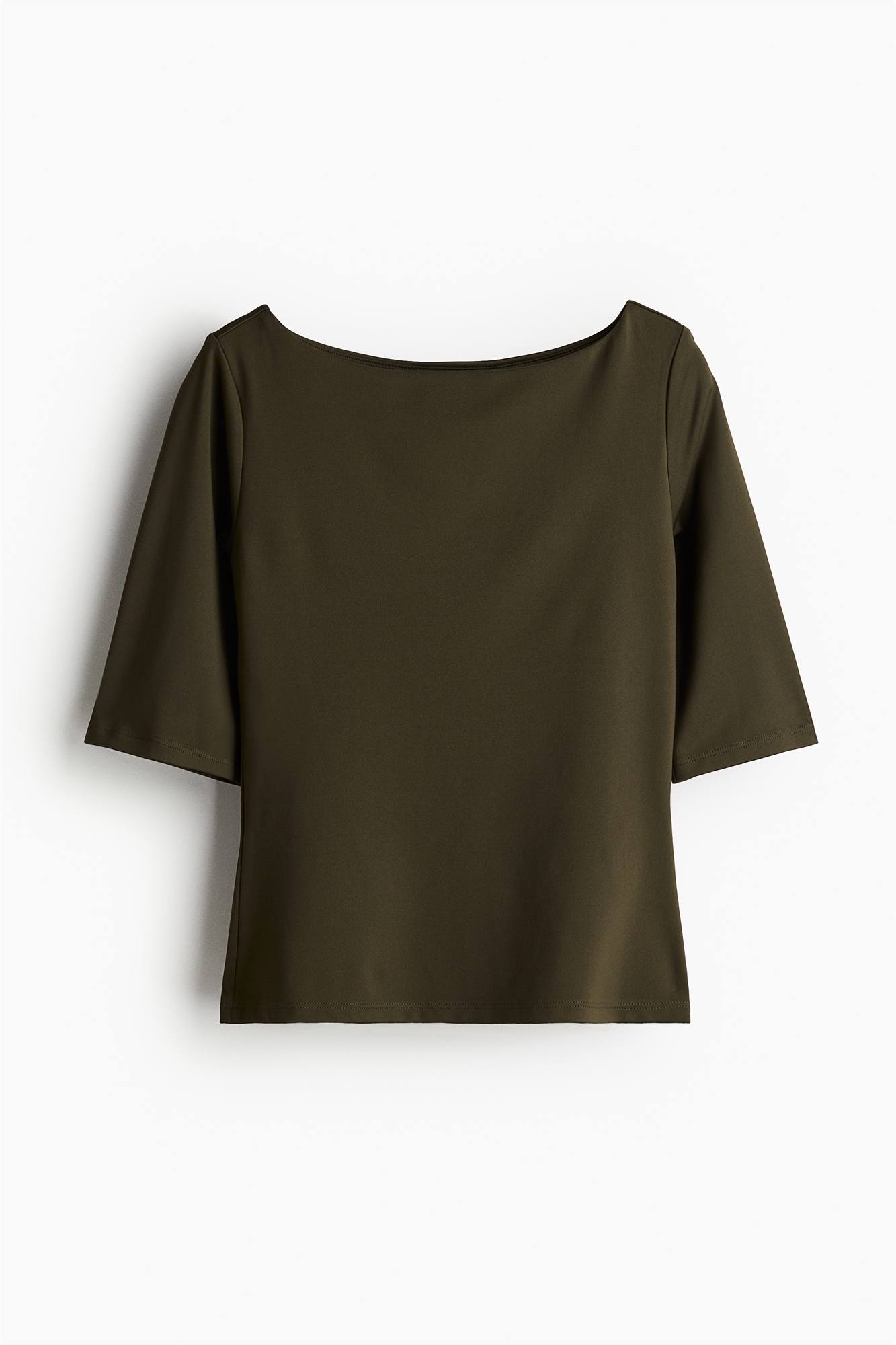 Облегающий топ из плотного трикотажа с вырезом-лодочкой и короткими рукавами. Верхняя часть на подкладке.