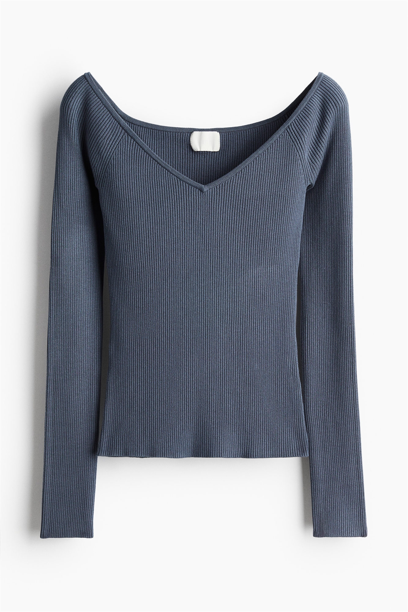 Облегающий топ без плеч из мягкого трикотажа в рубчик с V-образным вырезом и длинными рукавами.