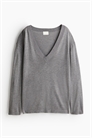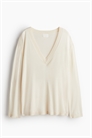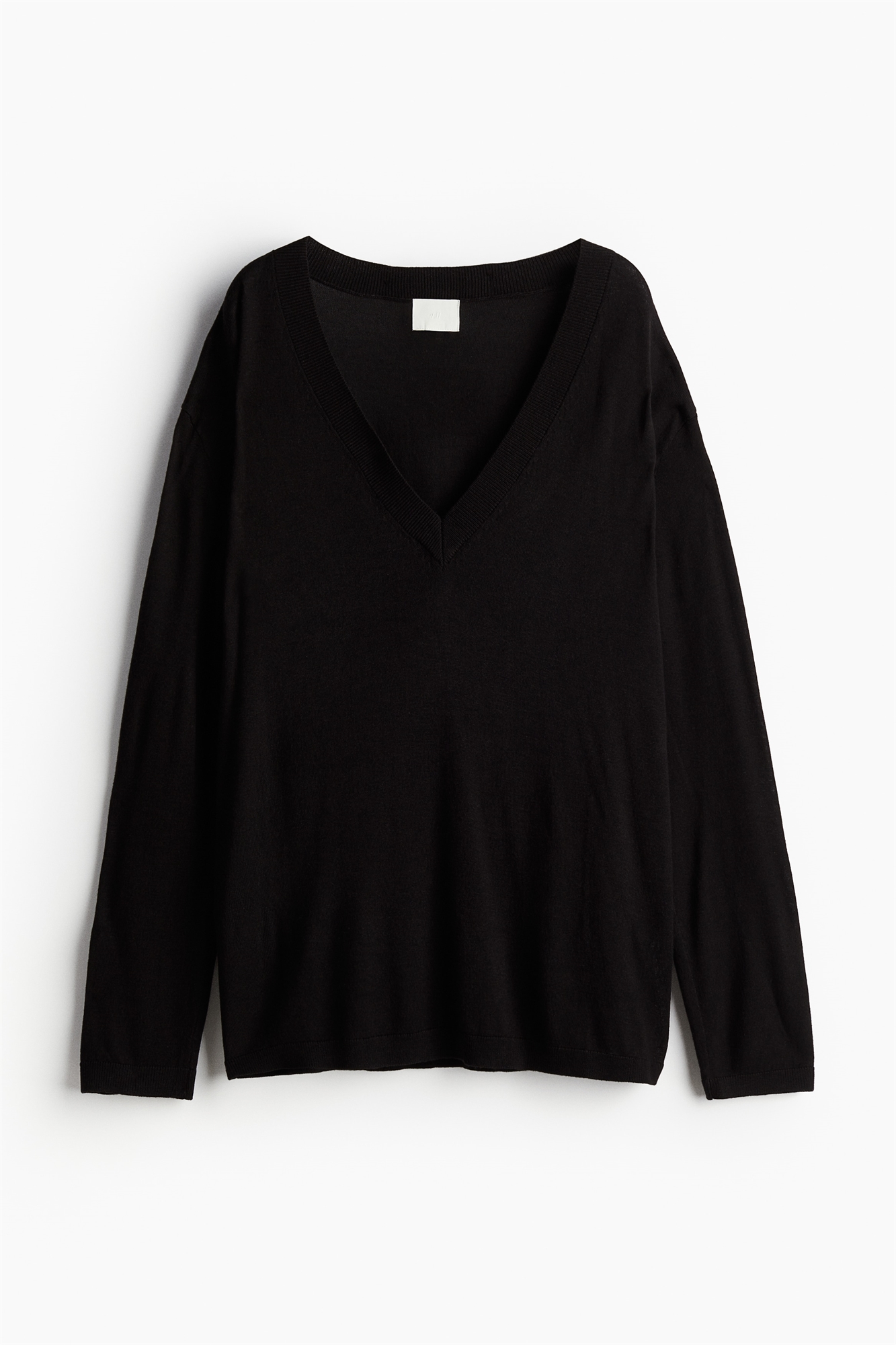 Слегка удлиненный джемпер свободного покроя из мягкого тонкого трикотажа с глубоким V-образным вырезом, спущенными плечами и длинными рукавами. Окантовка вокруг выреза, на манжетах и подоле.