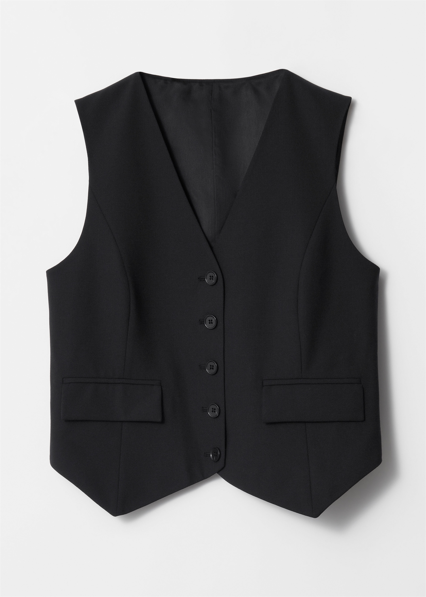 Приталенный шерстяной жилет с центральной застежкой на пуговицы. • V-образный вырез горловины • Пять пуговиц • 95% шерсти RWS, сертифицированной Control Union 1201053 • Длина жилета: 40 см / 15,7" (EU 36 / UK 8 / US 4)