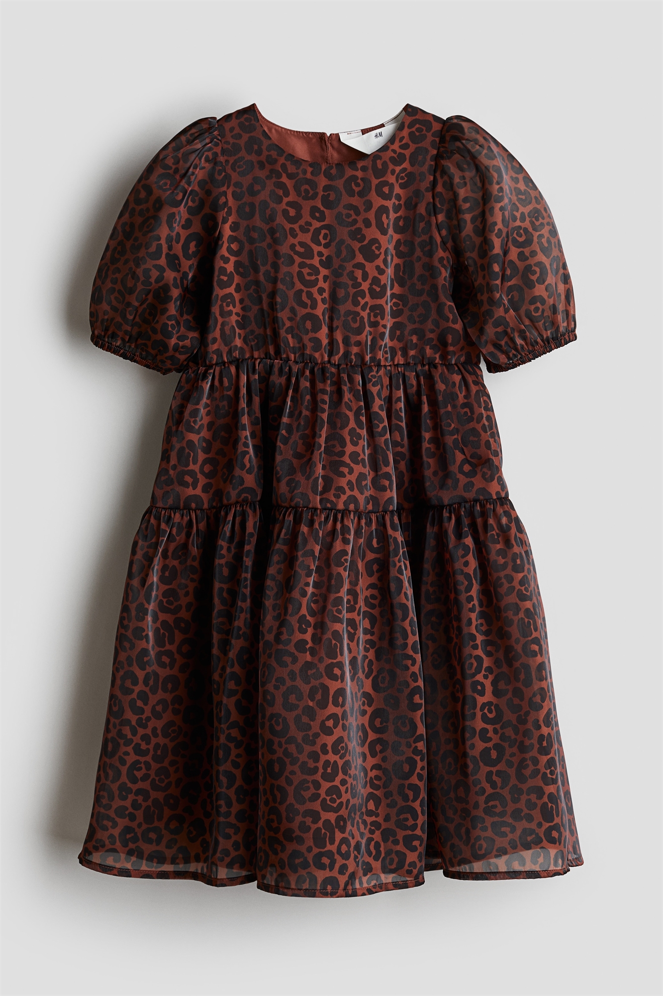 Платье из органзы с принтом на всю длину. Круглый вырез, отверстие для ключа с пуговицей сзади и короткие пышные рукава с эластичными манжетами. Эластичная талия и расклешенная юбка со сборками для придания объема. На подкладке.