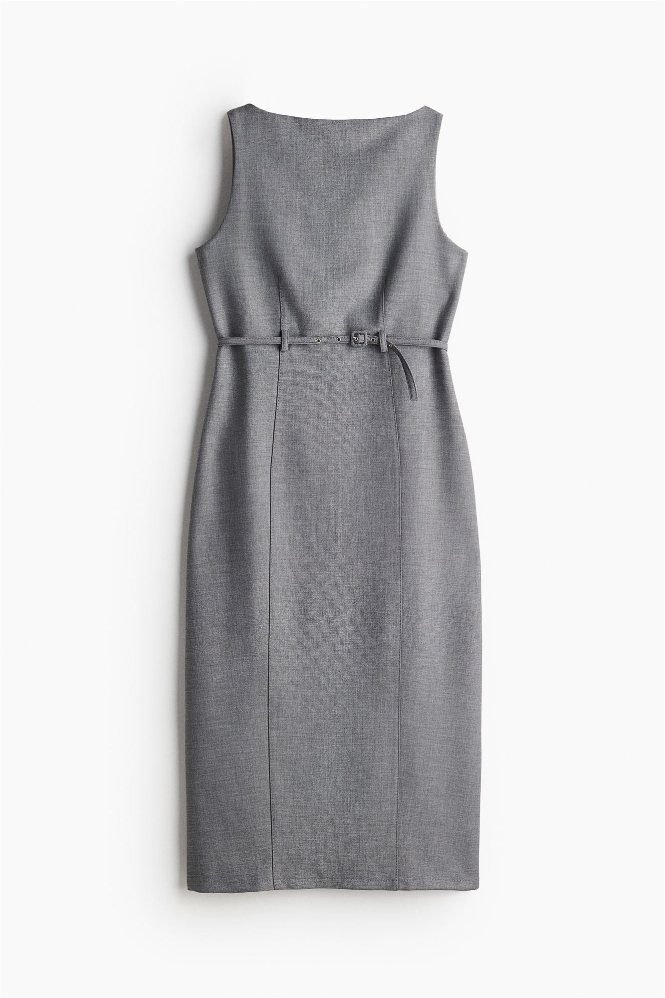 Приталенное платье без рукавов из тканого материала длиной до колен с вырезом-лодочкой и потайной застежкой-молнией сзади на шее. Формообразующие швы спереди и сзади и узкий съемный пояс на талии с застежкой-пряжкой. Одиночная вентиляция на спине. На подкладке.