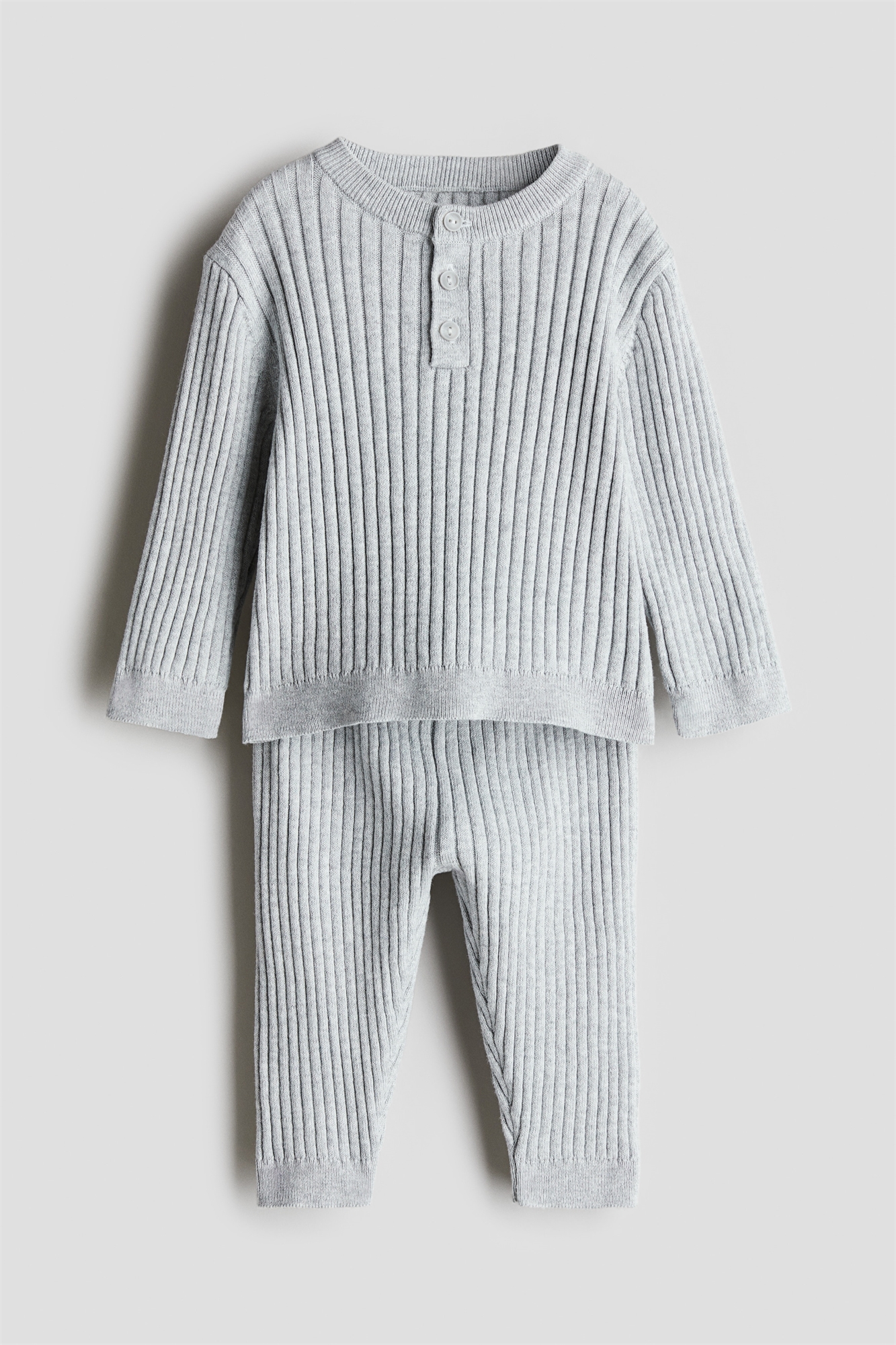 Комплект из топа и брюк Henley из мягкого ребристого хлопкового трикотажа. Топ с круглым вырезом в рубчик, застежкой на пуговицах, спущенными плечами и тесемками на манжетах и подоле. Брюки с эластичной утягивающейся талией и тесемками по подолу.