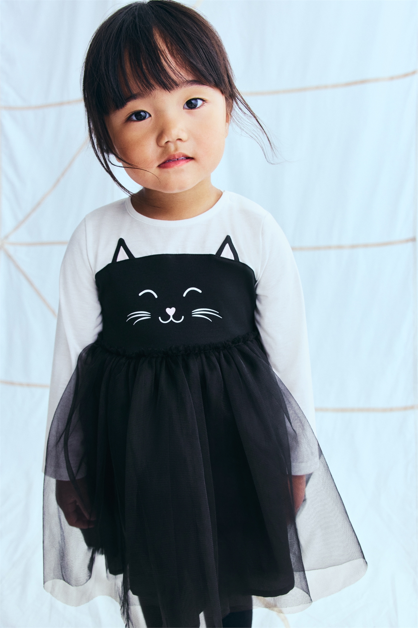 Маскарадный костюм из мягкого трикотажа с юбкой из нескольких слоев тюля. Круглый вырез, скрытая застежка на одном плече и длинные рукава.