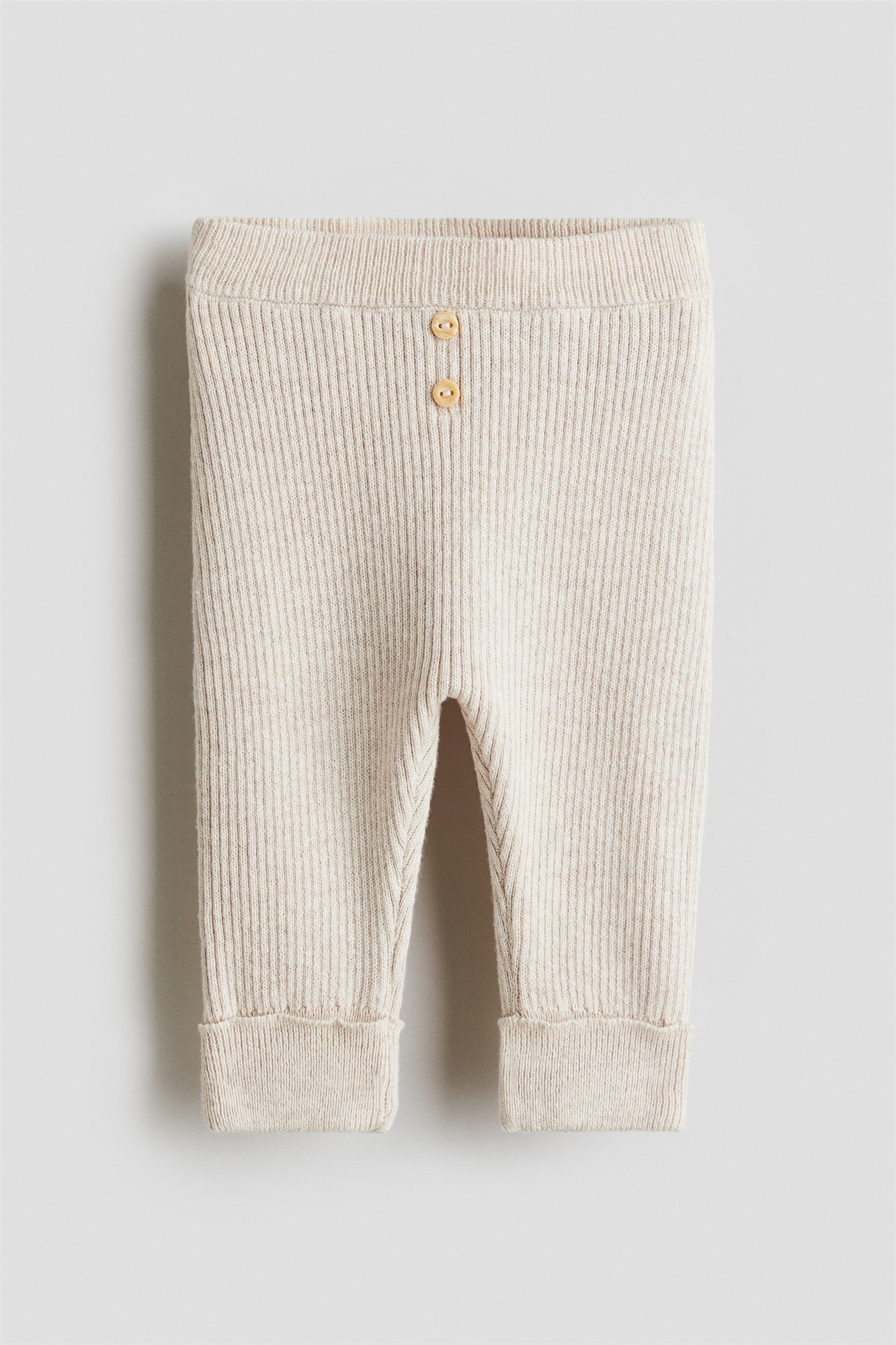 Ребристые брюки из хлопкового трикотажа с декоративными пуговицами спереди. Эластичный пояс и подвороты на ногах.