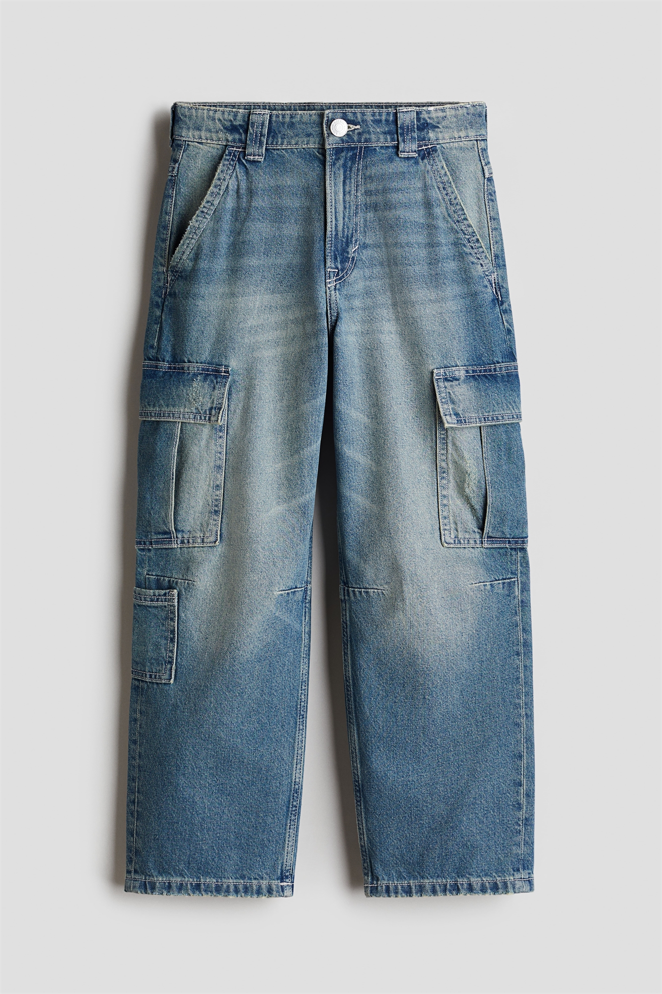 Джинсы в стиле карго из хлопкового денима с регулируемой резинкой на талии, ширинка на молнии с пуговицей, передние и задние карманы. Широкие штанины с втачными карманами и открытым накладным карманом.
