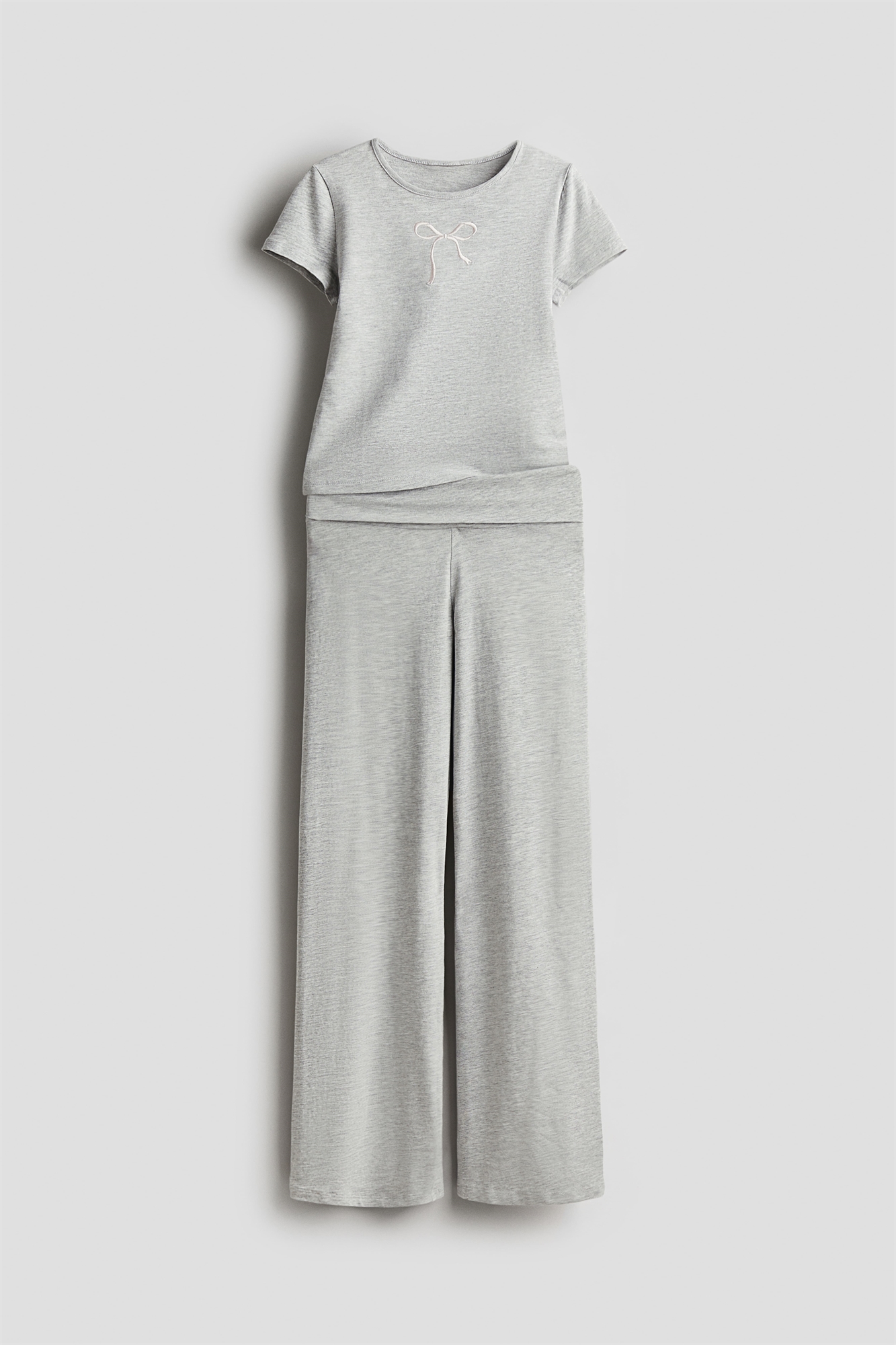 Пижама из мягкого хлопкового джерси. Верхняя часть с короткими рукавами и круглым вырезом и нижняя часть с расклешенными ногами и откидным поясом.