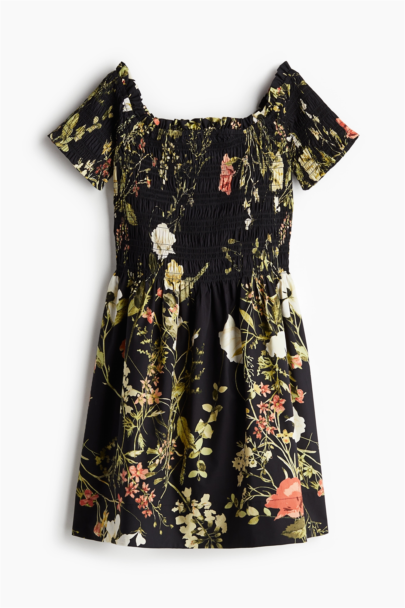 Короткое платье без плеч из тканого материала с приталенным лифом и короткими рукавами, украшенными плавками и небольшой оборкой по верхнему краю. Сборки на талии и расклешенная юбка. Без подкладки.
