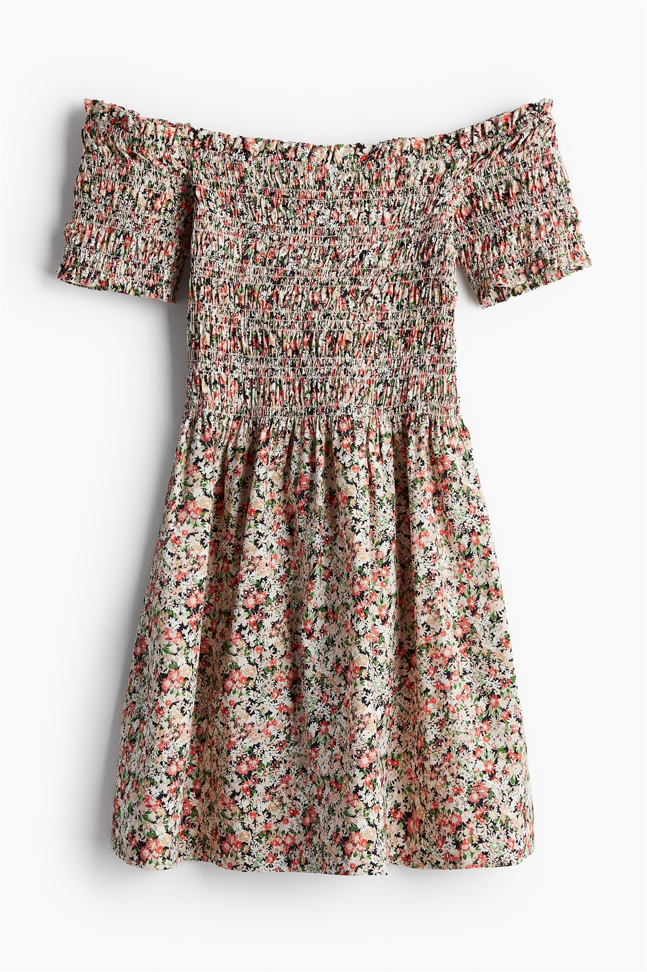 Короткое платье без плеч из тканого материала с приталенным лифом и короткими рукавами, украшенными плавками и небольшой оборкой по верхнему краю. Сборки на талии и расклешенная юбка. Без подкладки.