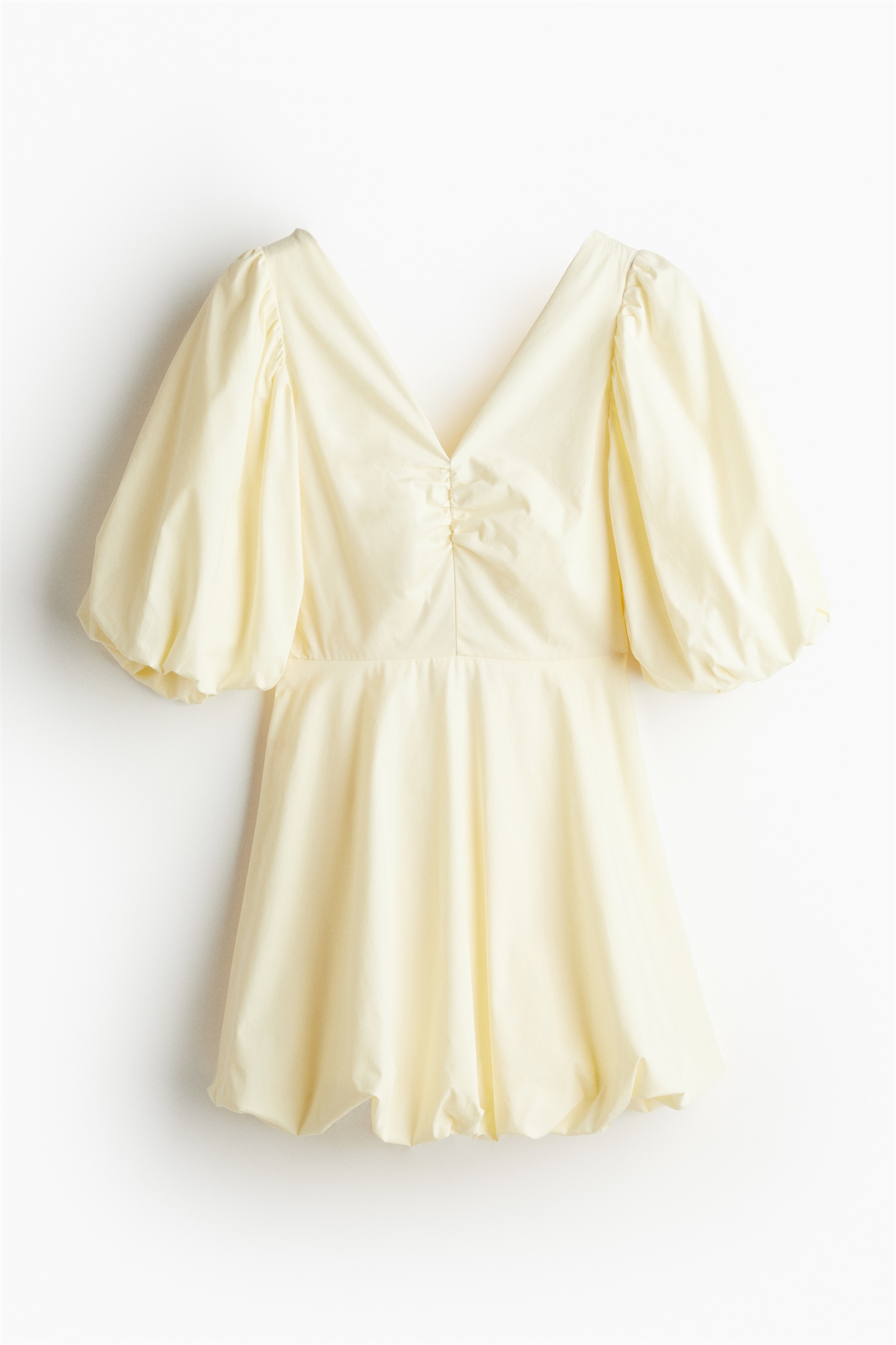 Короткое платье из хлопкового полотна с V-образным вырезом, сборчатым швом по центру бюста и широкими бретелями, завязывающимися бантом сзади. Эластичная резинка сзади на талии и потайная застежка-молния с одной стороны. Рукава-баллоны длиной до локтя и подол-пузырь создают пышный силуэт. На подкладке.