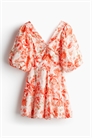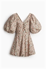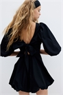 Короткое платье из хлопкового полотна с V-образным вырезом, сборчатым швом по центру бюста и широкими бретелями, завязывающимися бантом сзади. Эластичная резинка сзади на талии и потайная застежка-молния с одной стороны. Рукава-баллоны длиной до локтя и подол-пузырь создают пышный силуэт. На подкладке.