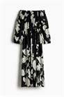 Платье длиной до колен, без плеч, из воздушного хлопка и вискозы. Свободный крой с небольшой оборкой и платочной вставкой в верхней части, длинные рукава-баллон с эластичными манжетами и эластичный шов на талии. Без подкладки.