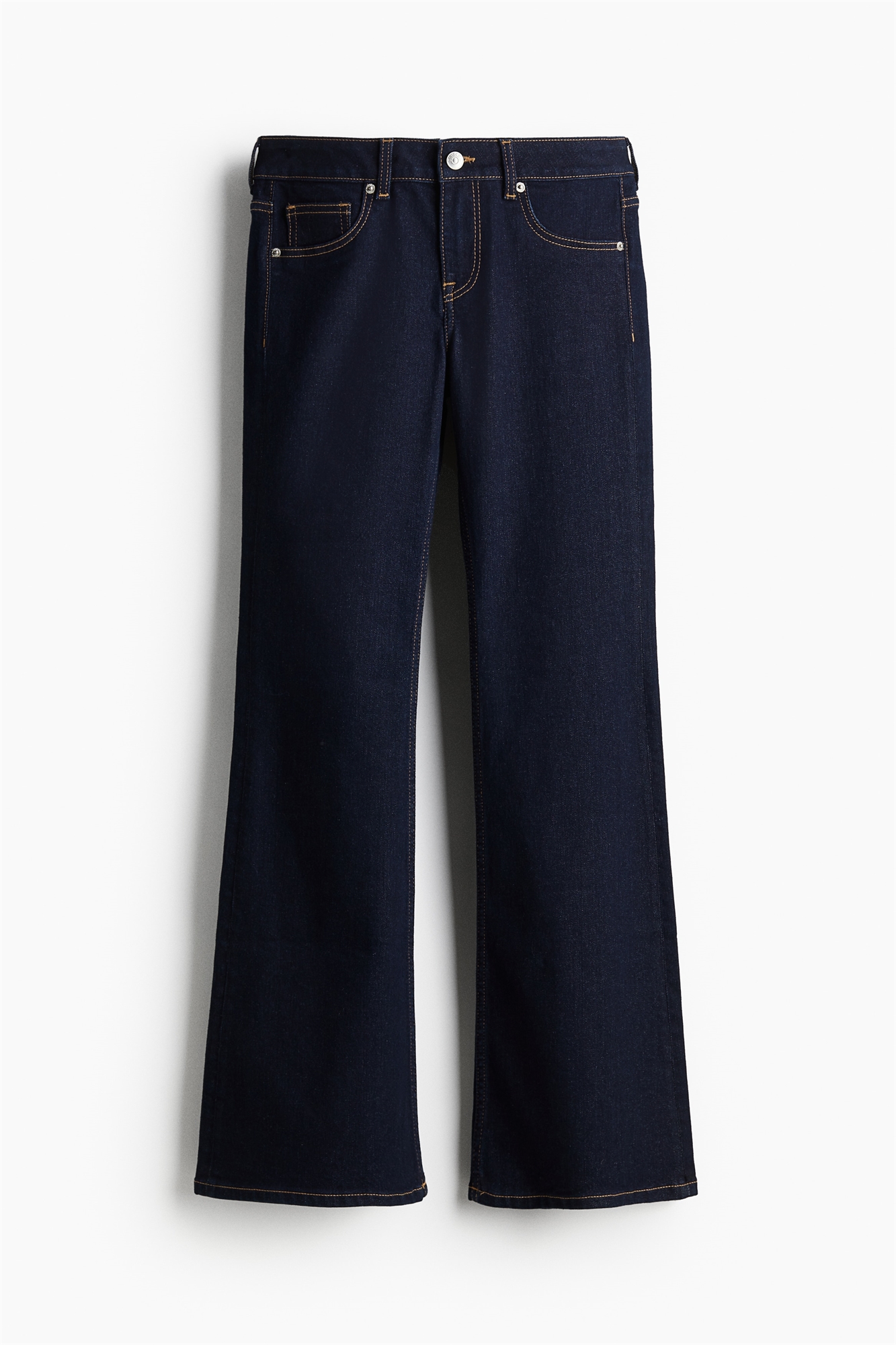 Джинсы из денима с легким стретчем для комфорта. Расклешенные штанины с зауженной посадкой от талии до бедра и расклешенным кроем от колена до подола. Заниженная талия, ширинка на молнии и пуговице. Фальшивые передние карманы, карман для монет и открытые задние карманы. Регулярная длина, рассчитанная на то, чтобы доходить до верхней части стопы с небольшим запасом или вообще без запаса. Икона моды с 70-х годов до наших дней.
