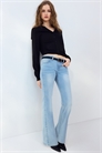 Джинсы из денима с легким стретчем для комфорта. Расклешенные штанины с зауженной посадкой от талии до бедра и расклешенным кроем от колена до подола. Заниженная талия, ширинка на молнии и пуговице. Фальшивые передние карманы, карман для монет и открытые задние карманы. Регулярная длина, рассчитанная на то, чтобы доходить до верхней части стопы с небольшим запасом или вообще без запаса. Икона моды с 70-х годов до наших дней.
