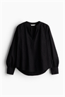 Свободная блузка из воздушного хлопкового жаккарда с воротником-бантом и V-образной проймой спереди. Длинные рукава реглан с широкими манжетами на пуговицах. Удлиненные сзади.