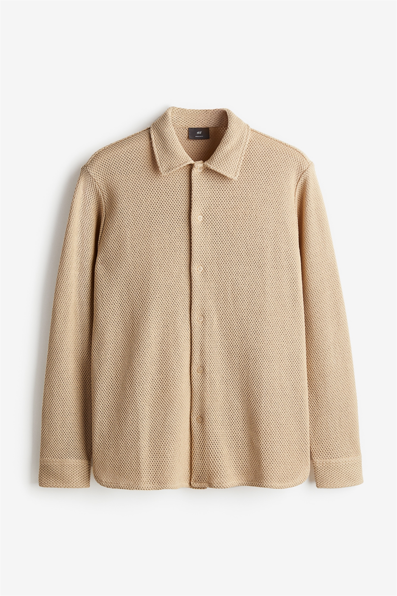 Рубашка из мягкого дырчатого трикотажа с воротником-стойкой, французским передом и закругленным подолом. Длинные рукава с манжетами на пуговицах и втачным рукавом. Регулярный крой для комфортной носки и классического силуэта.