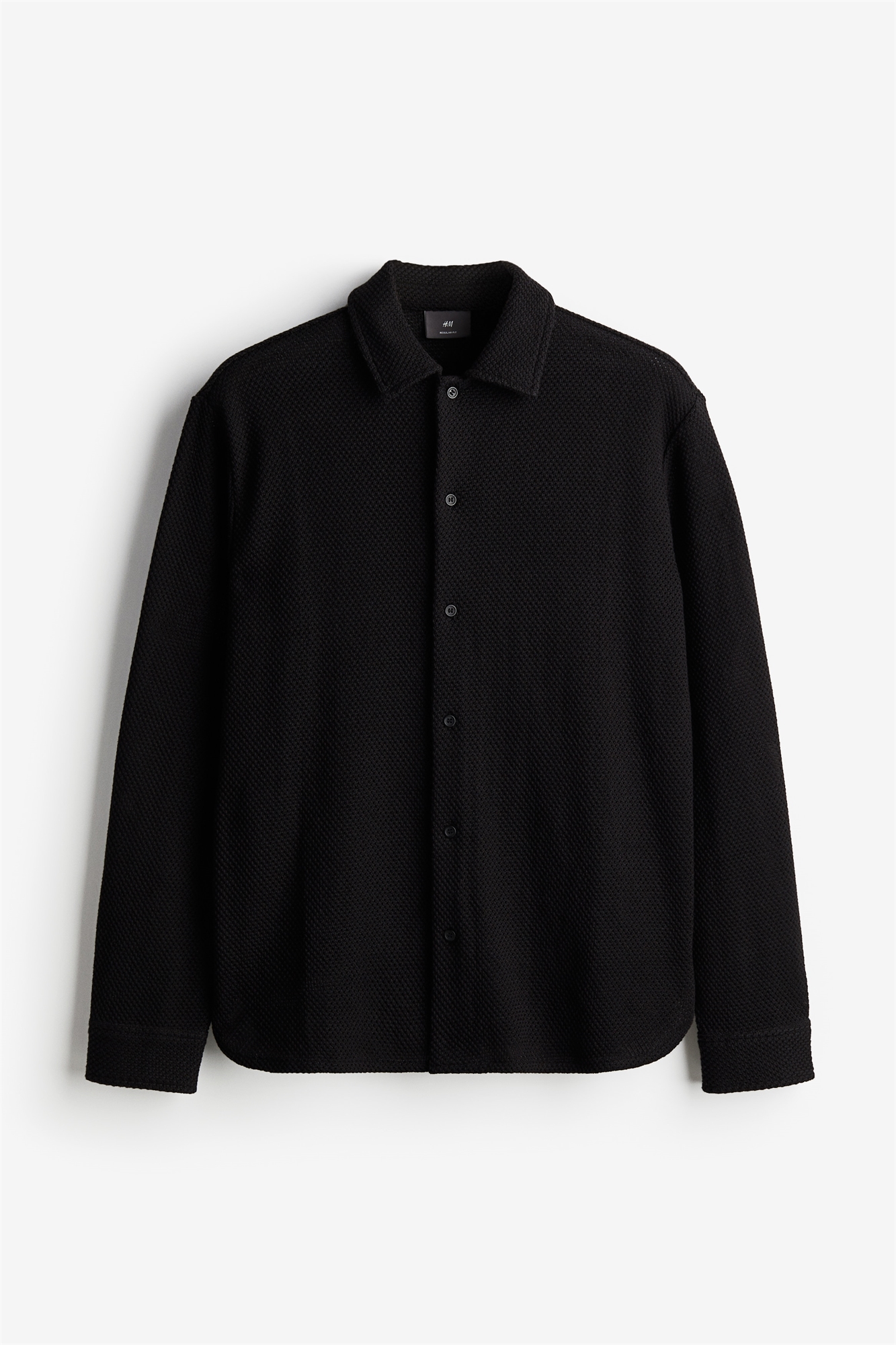 Рубашка из мягкого дырчатого трикотажа с воротником-стойкой, французским передом и закругленным подолом. Длинные рукава с манжетами на пуговицах и втачным рукавом. Регулярный крой для комфортной носки и классического силуэта.
