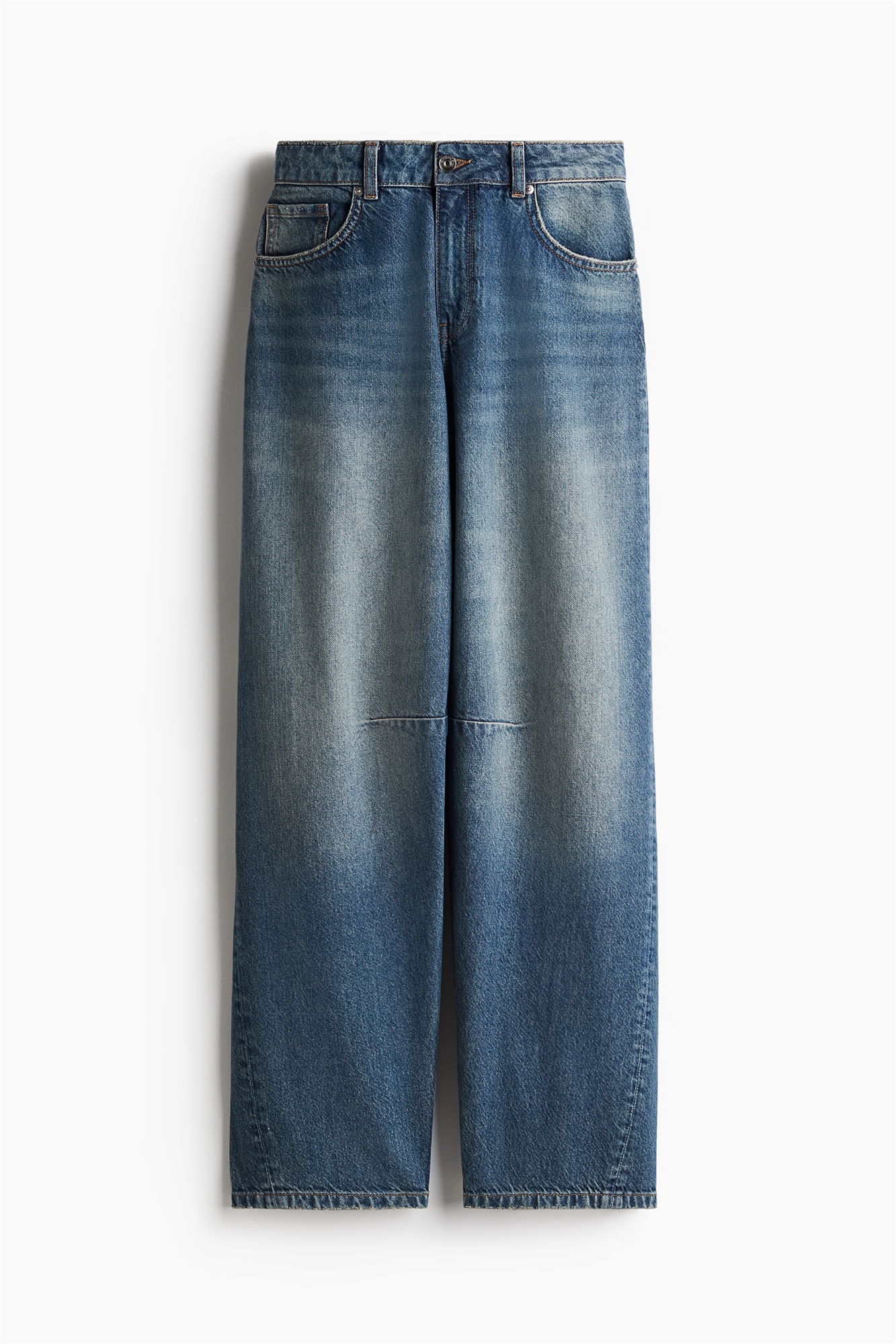 Джинсы с 5 карманами из жесткого хлопкового денима, который сначала кажется твердым, но затем смягчается и ослабевает по мере носки. Изогнутая, объемная штанина со свободной посадкой от бедра до бедра, которая затем сужается к подолу. Регулярная талия с ширинкой на молнии и пуговице. Обычная длина, рассчитанная на то, чтобы доходить до верхней части стопы с минимальной или нулевой укладкой. Дизайн, который переходит от элегантного и шикарного к спортивному и крутому.